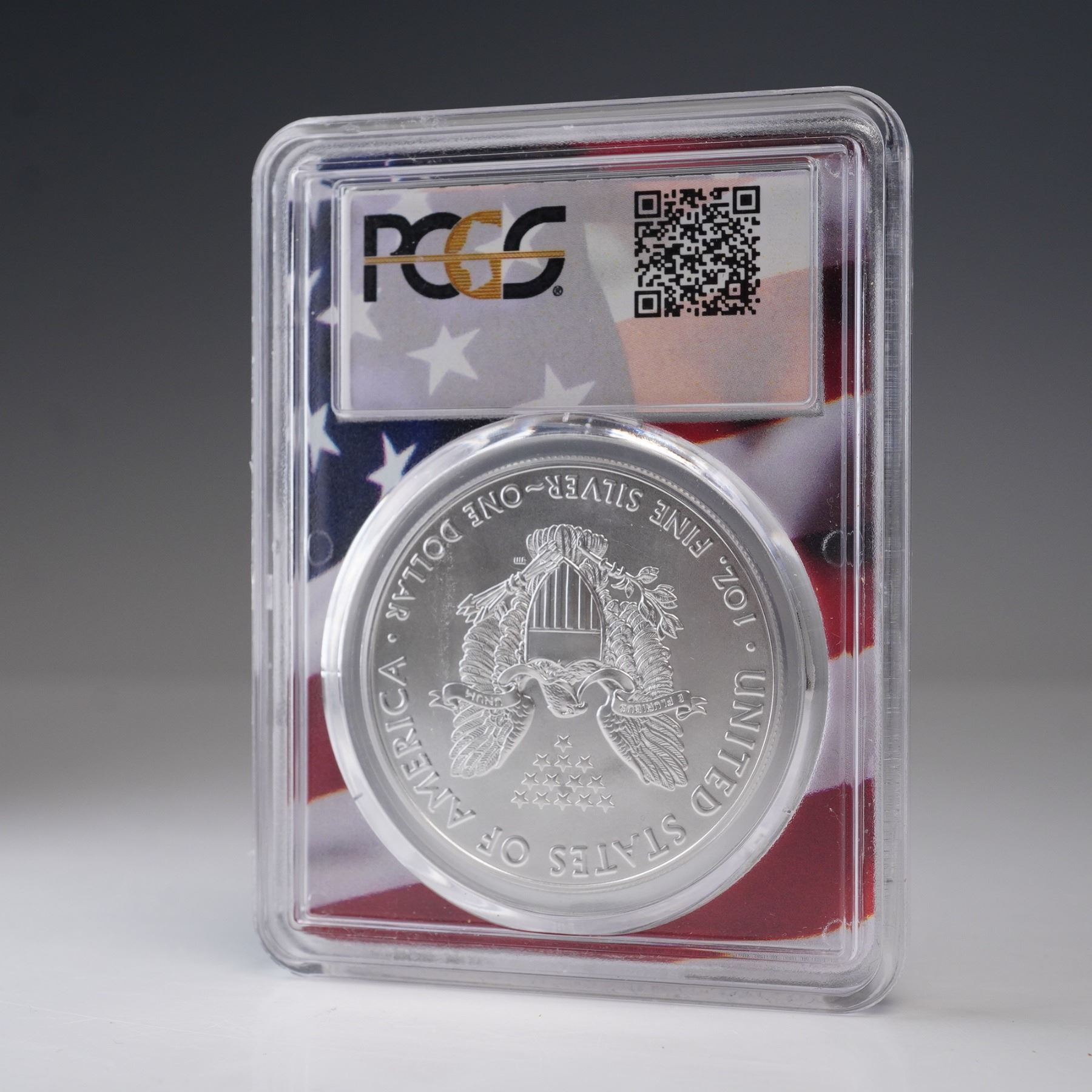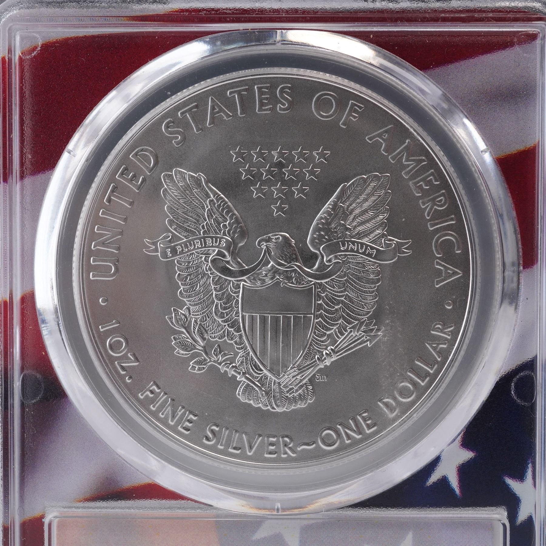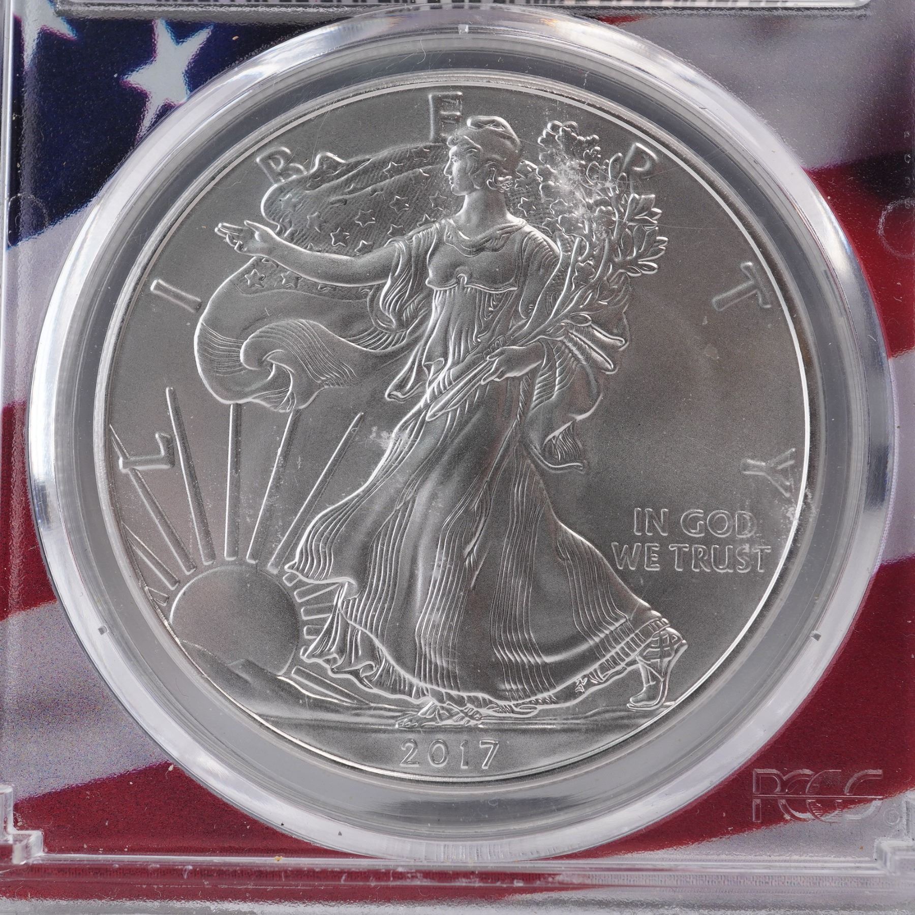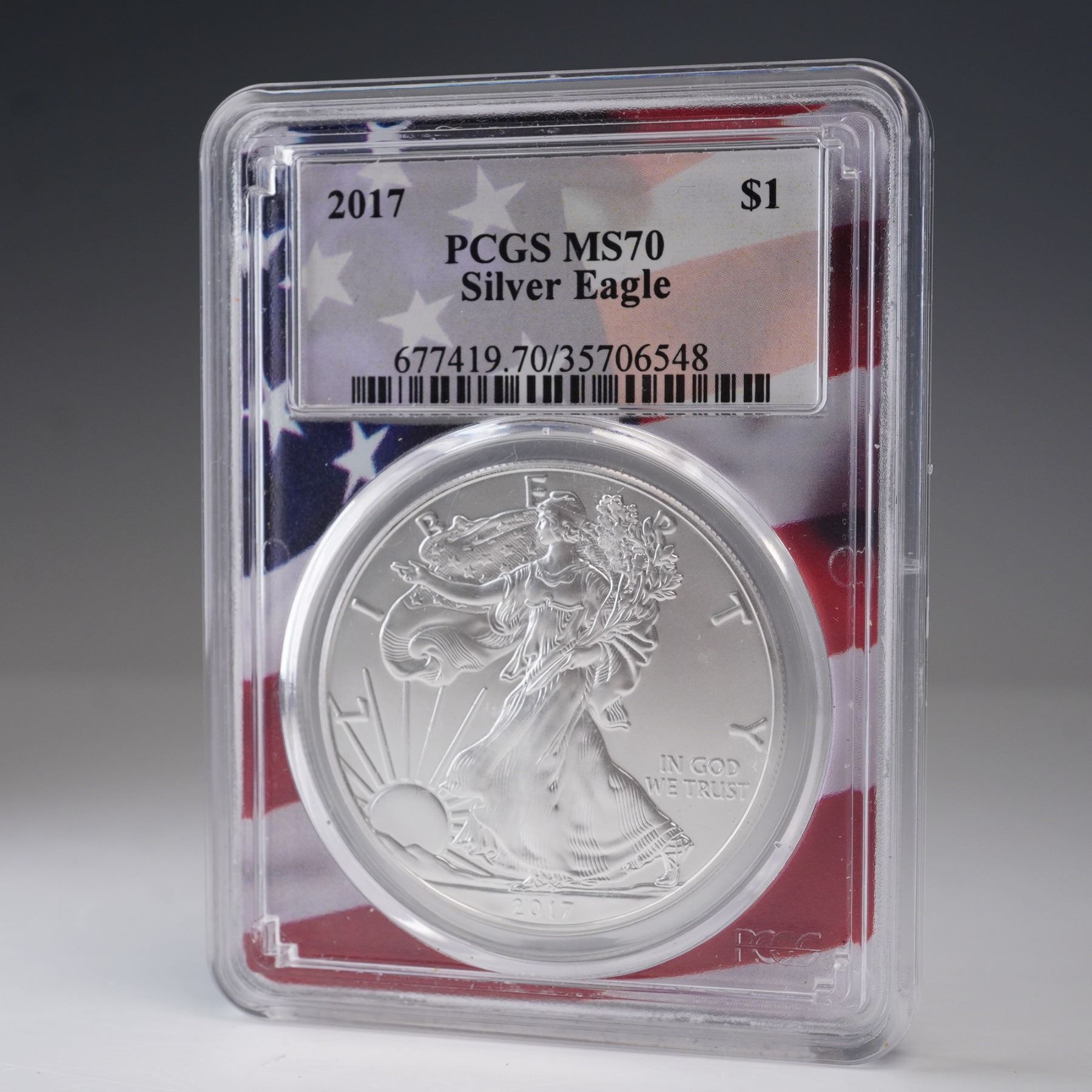 2017 United States one dollar American Silver Eagle coin, certified and encapsulated by PCGS with a Mint State 70 (MS70) grade. The obverse features the classic Walking Liberty design originally created by Adolph A. Weinman in 1916, depicting Liberty striding confidently toward the sunrise, draped in the United States flag. She extends her right hand forward while carrying branches of laurel and oak in her left arm, symbolizing strength and peace. The reverse shows a heraldic American eagle behind a shield, based on the United States Coat of Arms. The eagle holds arrows in one talon and an olive branch in the other, and a banner in its beak reads E PLURIBUS UNUM. Thirteen stars are arrayed above the eagle, representing the original colonies. This bullion coin is struck in one troy ounce of .999 fine silver. Graded and encapsulated by PCGS, the coin is housed in a tamper-evident slab with a patriotic flag design background. Slab: 2.5"L x 0.5"W x 3.25"H. Coin diameter: 39mm.