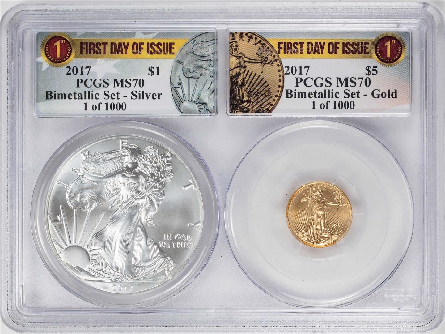 One 2017 American Silver & Gold Eagle Bimetallic Set PCGS MS70 First Day of Issue. PCGS Graded.