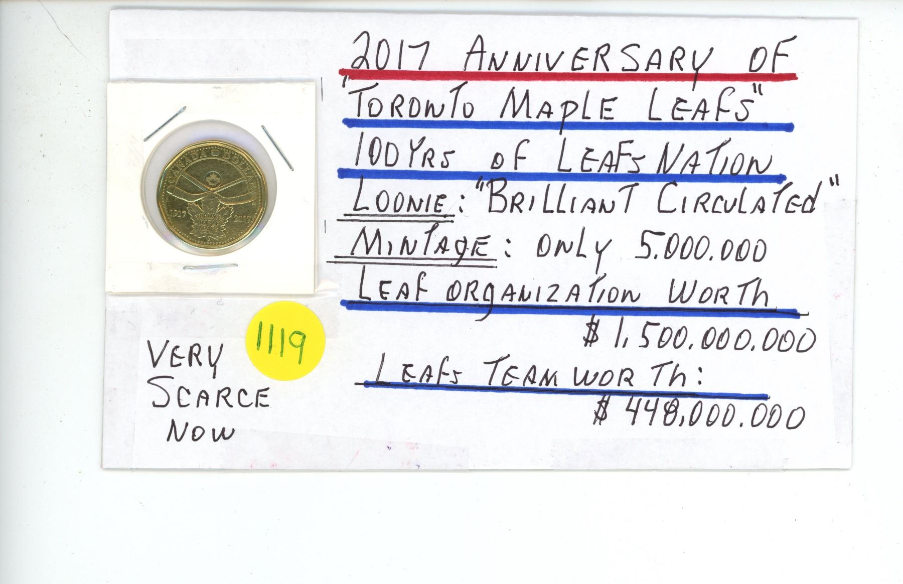 2017 Anniversary of "Toronto Maple Leafs" 100yrs of Leafs Nation. Loonie: "Brilliant Circulated". Mintage: Only 5,000,000. Very Scarce