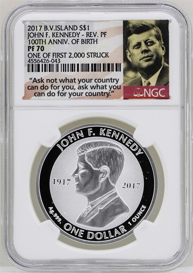 One 2017 British Virgin Islands $1 John F. Kennedy Reverse Proof Coin NGC PF70. NGC Certified.