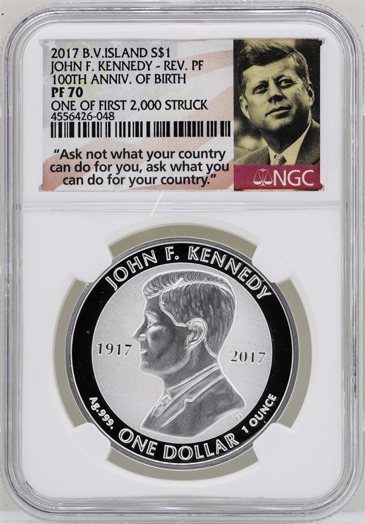One 2017 British Virgin Islands $1 John F. Kennedy Reverse Proof Coin NGC PF70. NGC Certified.