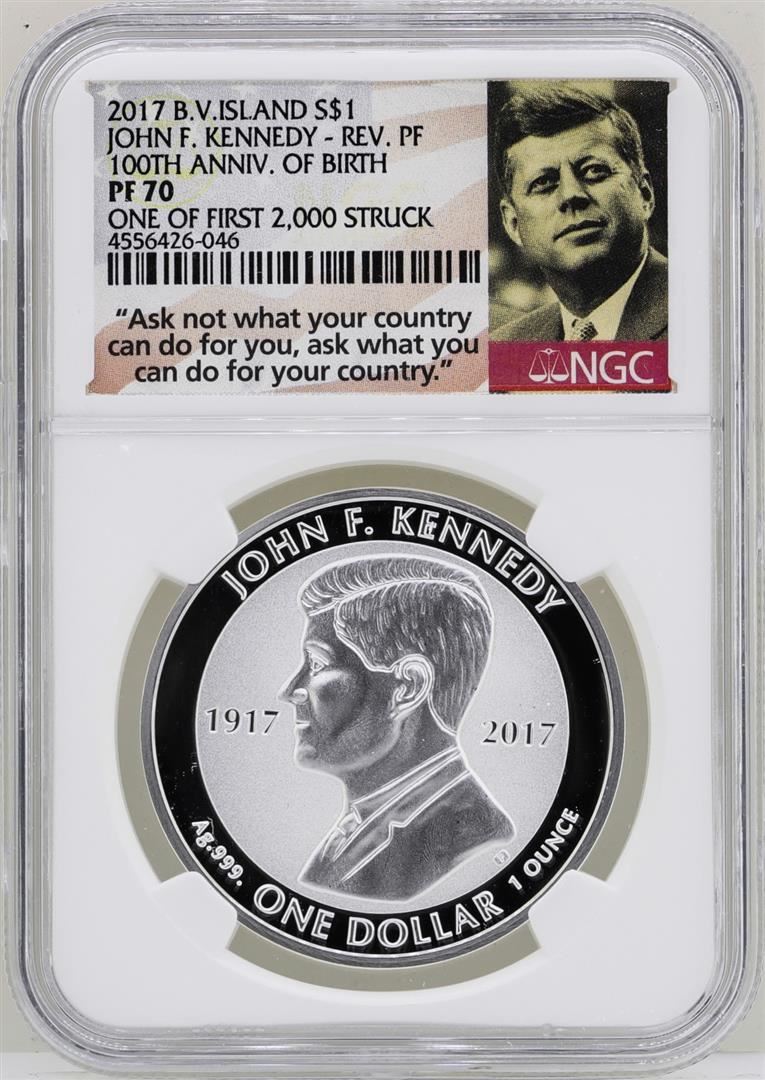 One 2017 British Virgin Islands $1 John F. Kennedy Reverse Proof Coin NGC PF70. NGC Certified.