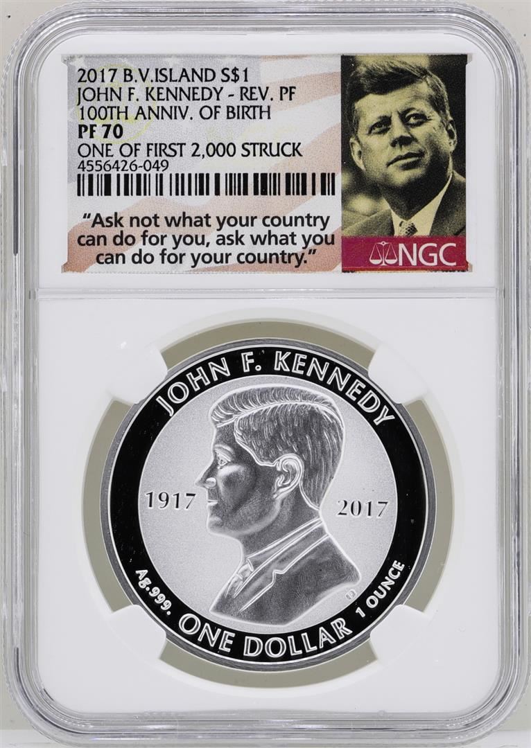 One 2017 British Virgin Islands $1 John F. Kennedy Reverse Proof Coin NGC PF70. NGC Certified.