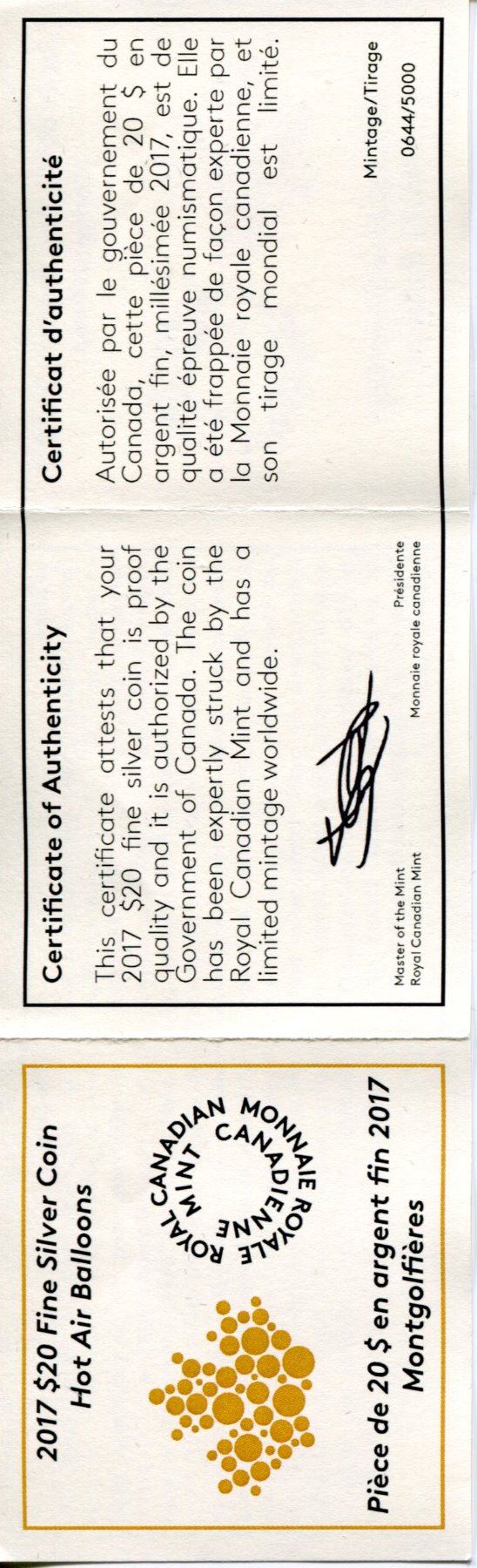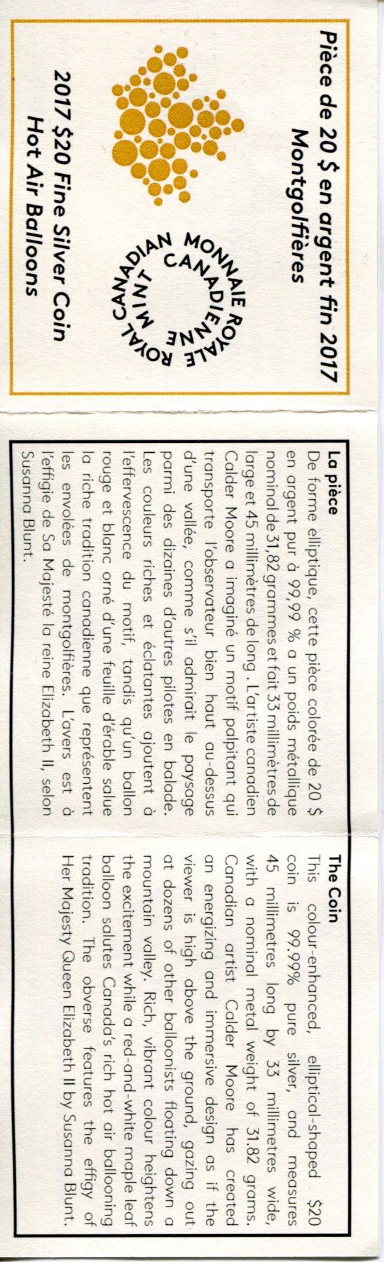 2017 CNDN 20 DOLLAR PC *FINE SILVER* (HOT AIR BALLOONS) *99.99 PURE SILVER*