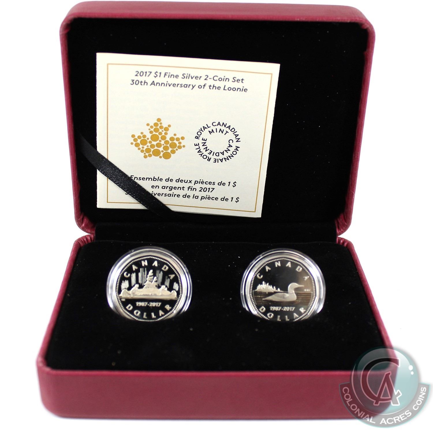 2017 Canada $1 30th Anniversary of the Loonie Fine Silver 2-coin Set Encapsulated in Red RCM Display Box (display case has discolouring). Tax Exempt