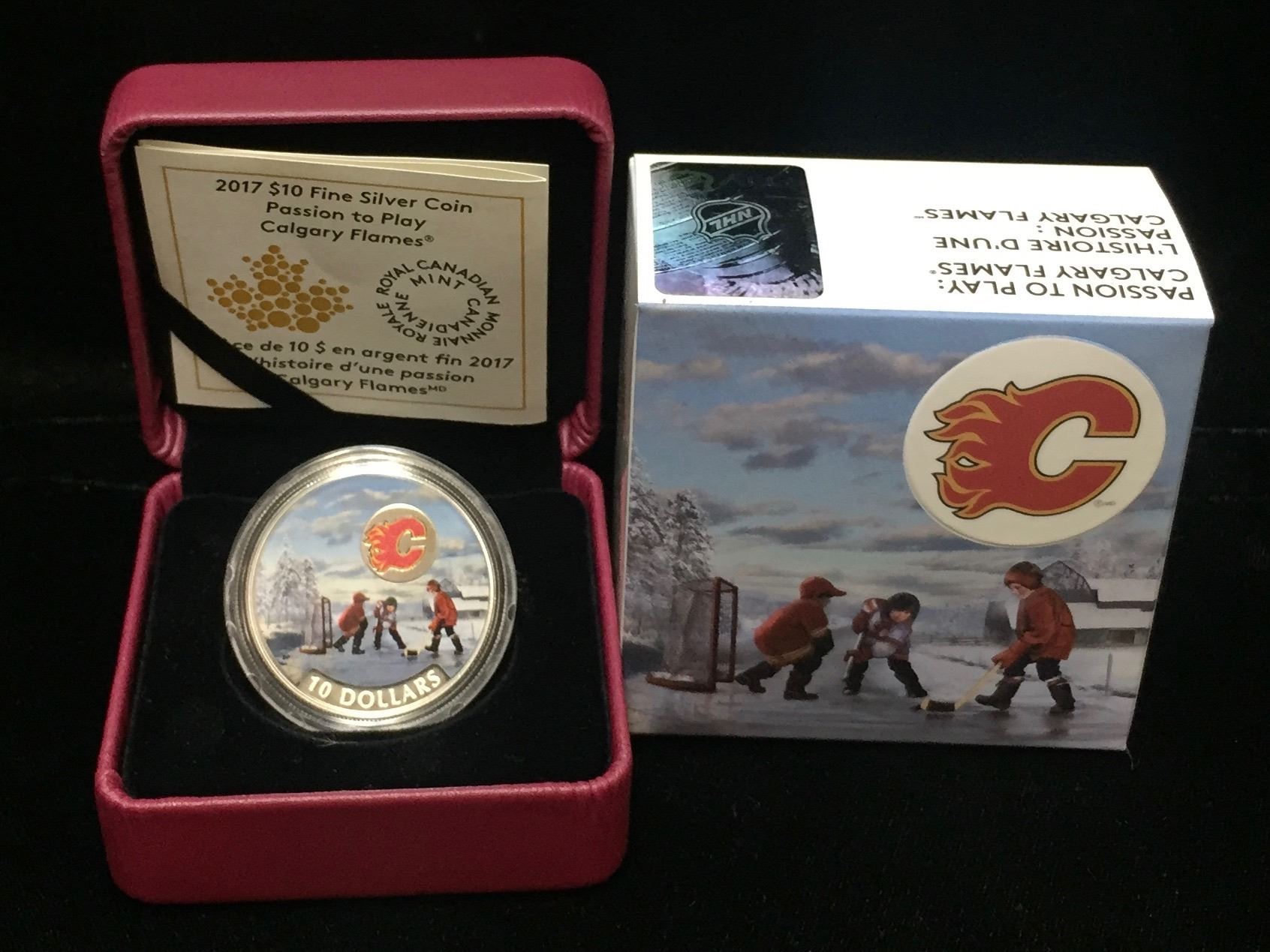 Lot 64; Royal Canadian Mint, 2017 Canada $10 Calgary Flames: Passion to Play Coloured Proof Silver Coin, Colour, Proof Finish, Queen Elizbaeth II Effigy, RCM Packing