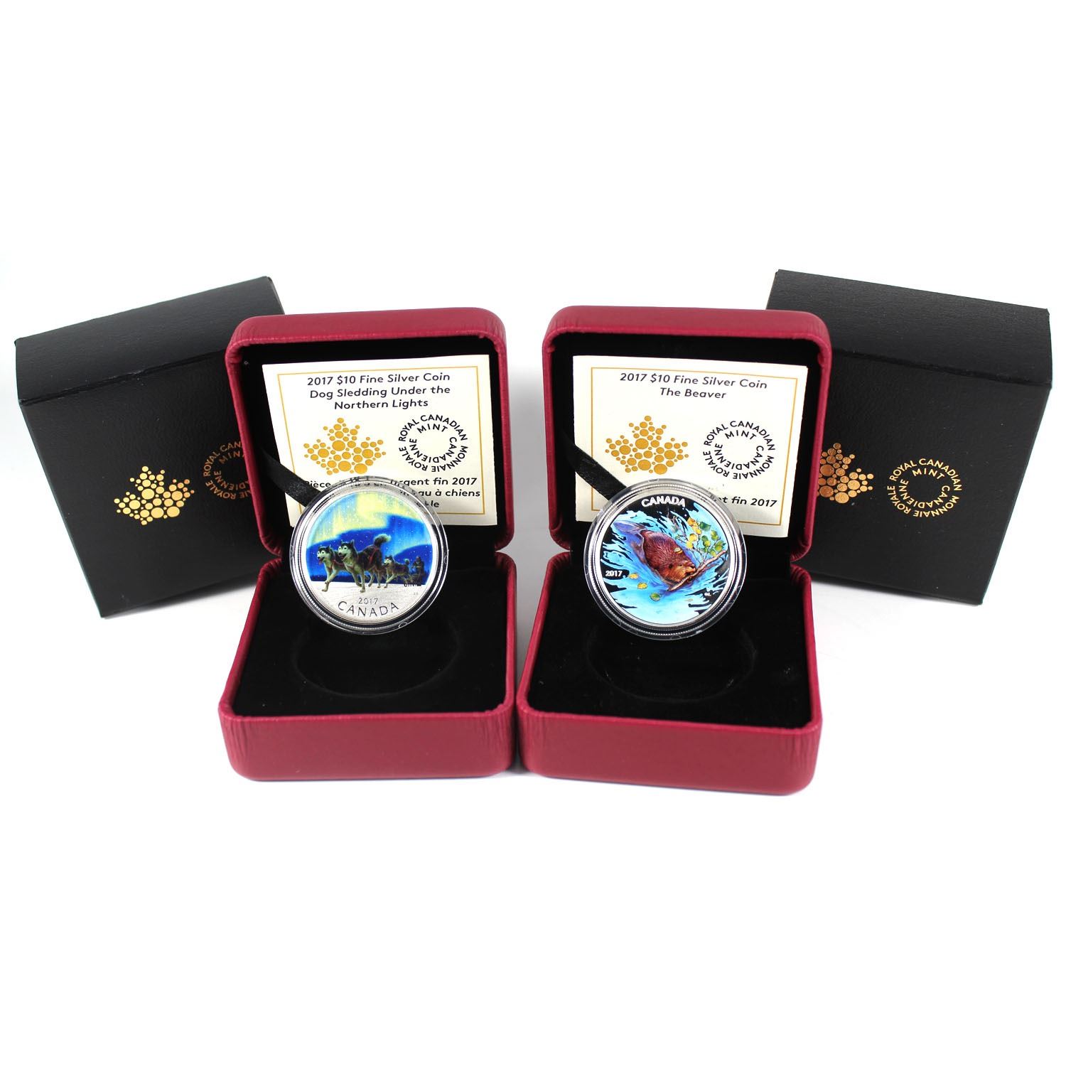 2017 Canada $10 Dog Sledding Under the Northern Lights & 2017 $10 Beaver Fine Silver Coin (Tax Exempt). 2017 $10 Beaver outer box is taped. 2pcs