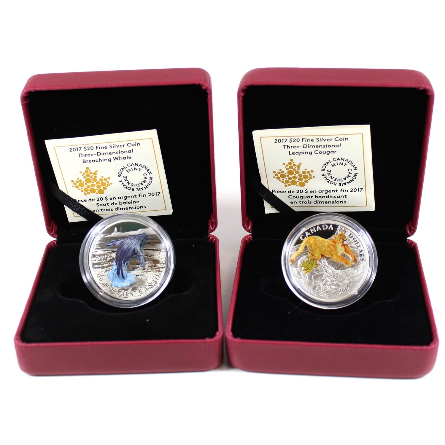 2017 Canada $20 Breaching Whale & 2017 Leaping Cougar Three-Dimensional Fine Silver Coins (Tax Exempt). Coins come encapsulated with display box and certificate. 2pcs