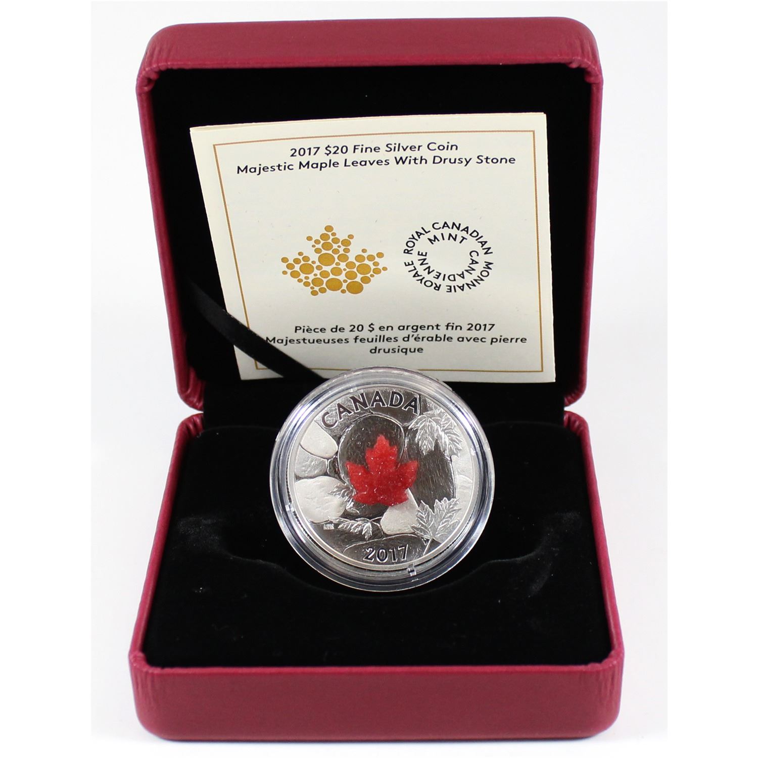 2017 Canada $20 Majestic Maple Leaves with Drusy Stone Fine Silver Coin (Tax Exempt). Coin comes encapsulated with display box and certificate.