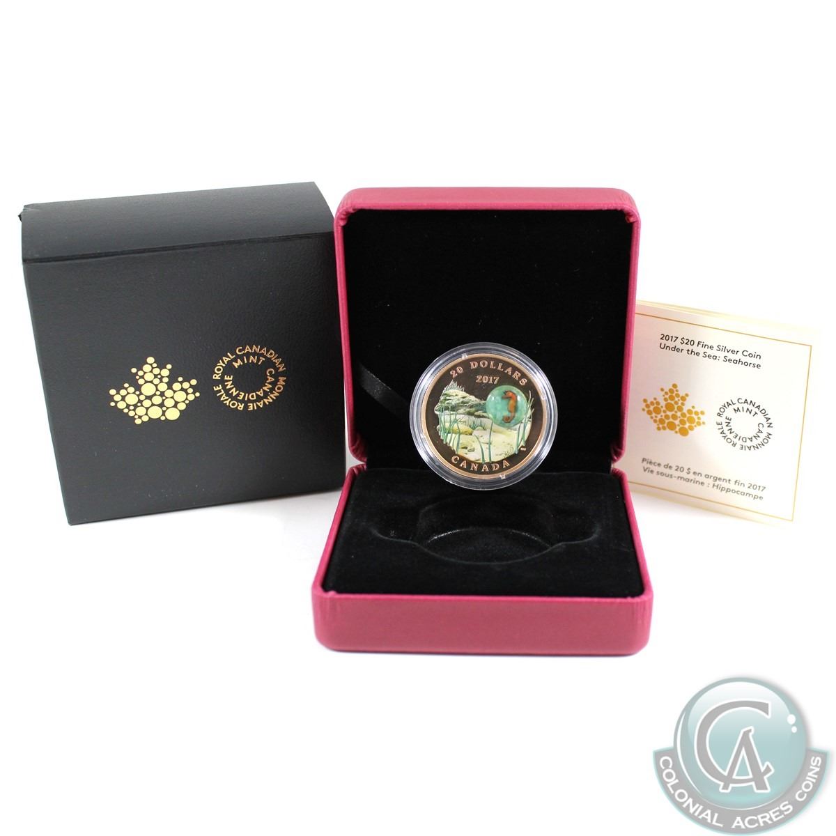 2017 Canada $20 Under the Sea - Seahorse Fine Silver Coin (Tax Exempt). One corner of the outer box is bent and coin contains even rose coloured toning.