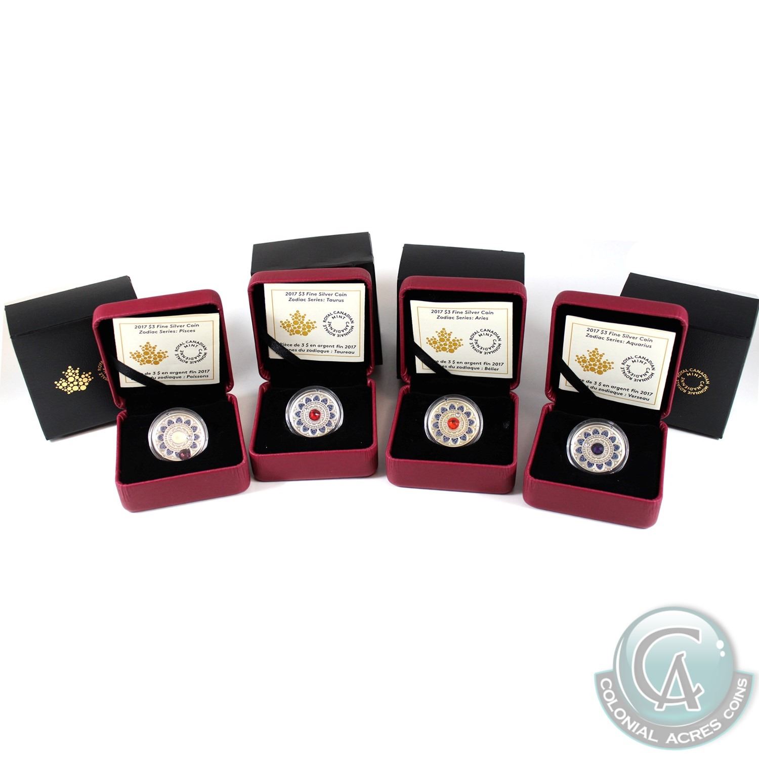 2017 Canada $3 Fine Silver Zodiac Series coins (Tax Exempt). You will receive Aquarius, Pisces, Taurus & Aries. Some coins are lightly toned and packaging contain minor imperfections. 4pcs