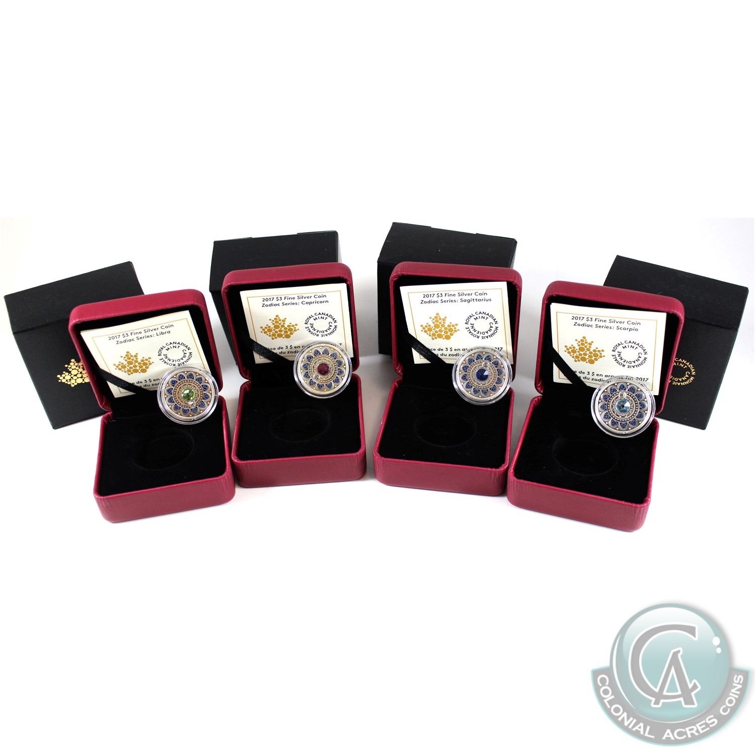 2017 Canada $3 Fine Silver Zodiac Series coins (Tax Exempt). You will receive Capricorn, Libra, Scorpio & Sagittarius. Some coins are lightly toned and packaging contain minor imperfections. 4pcs