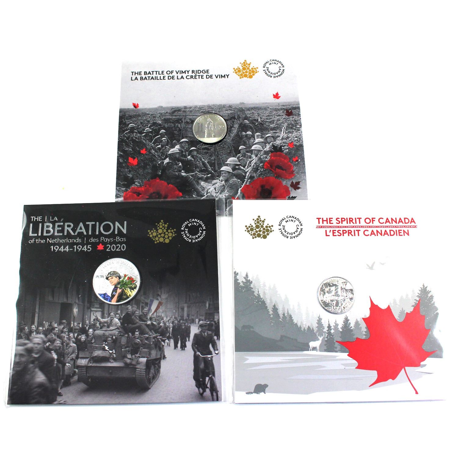 2017 Canada $3 The Spirit of Canada, 2017 $3 100th Anniversary of the Battle of Vimy Ridge & 2020 $10 75th Anniversary of the Liberation of the Netherlands - Canadian Army Fine Silver Coins. 3pcs (TAX Exempt)