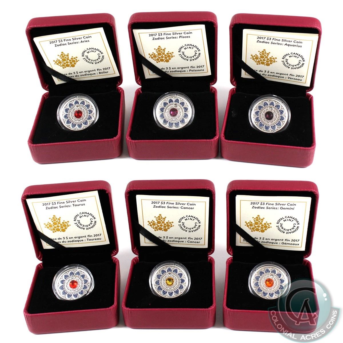 2017 Canada $3 Zodiac Fine Silver Coin Collection (Tax Exempt). You will receive, Taurus, Cancer, Aries, Gemini, Pisces, and Aquarius. Coins come encapsulated in original RCM Clamshell cases with COAs. 6pcs.