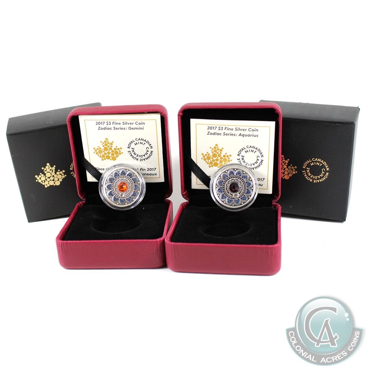 2017 Canada $3 Zodiac Series - Gemini & Aquarius Fine Silver Coins (TAX Exempt). 2pcs.