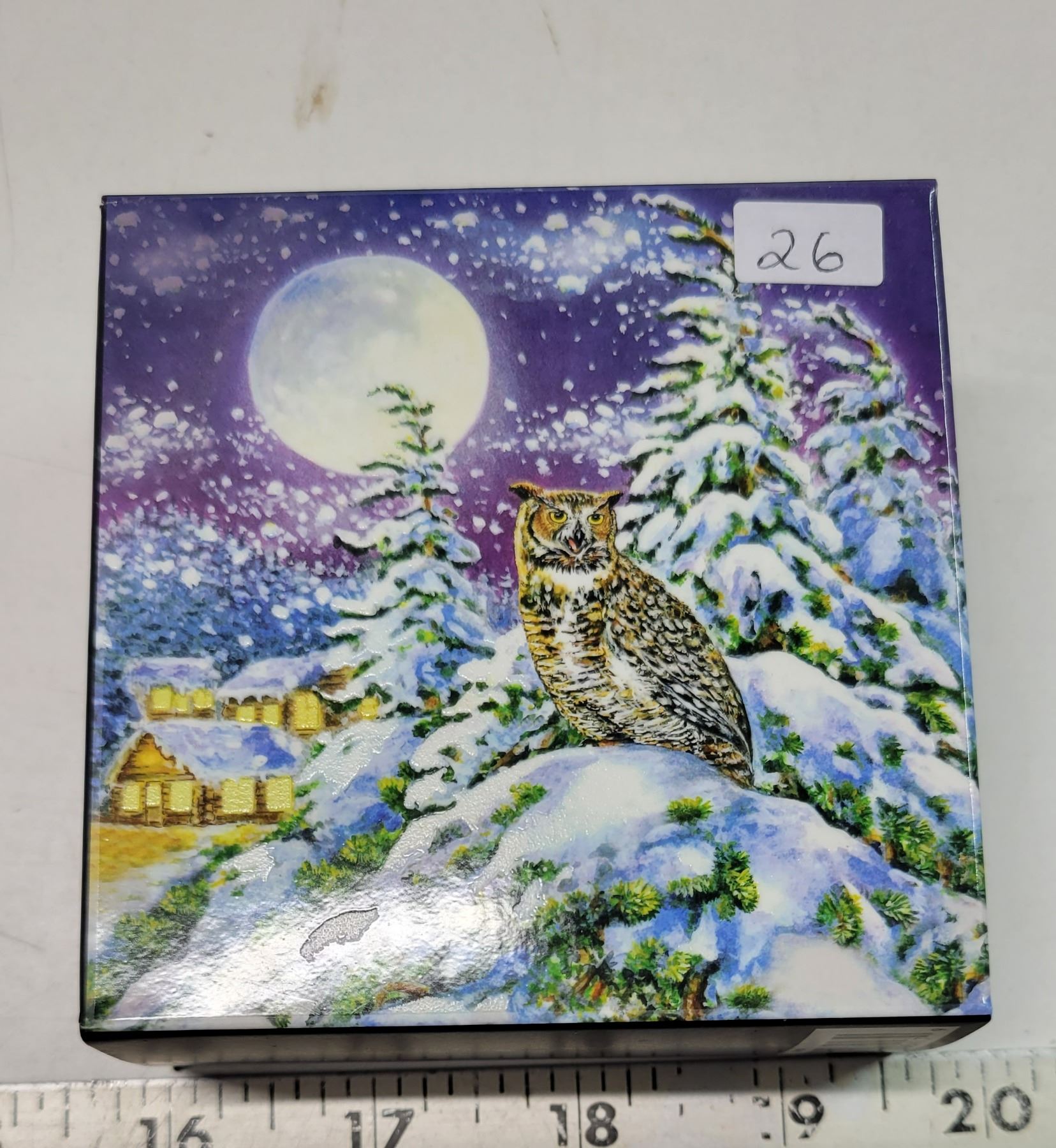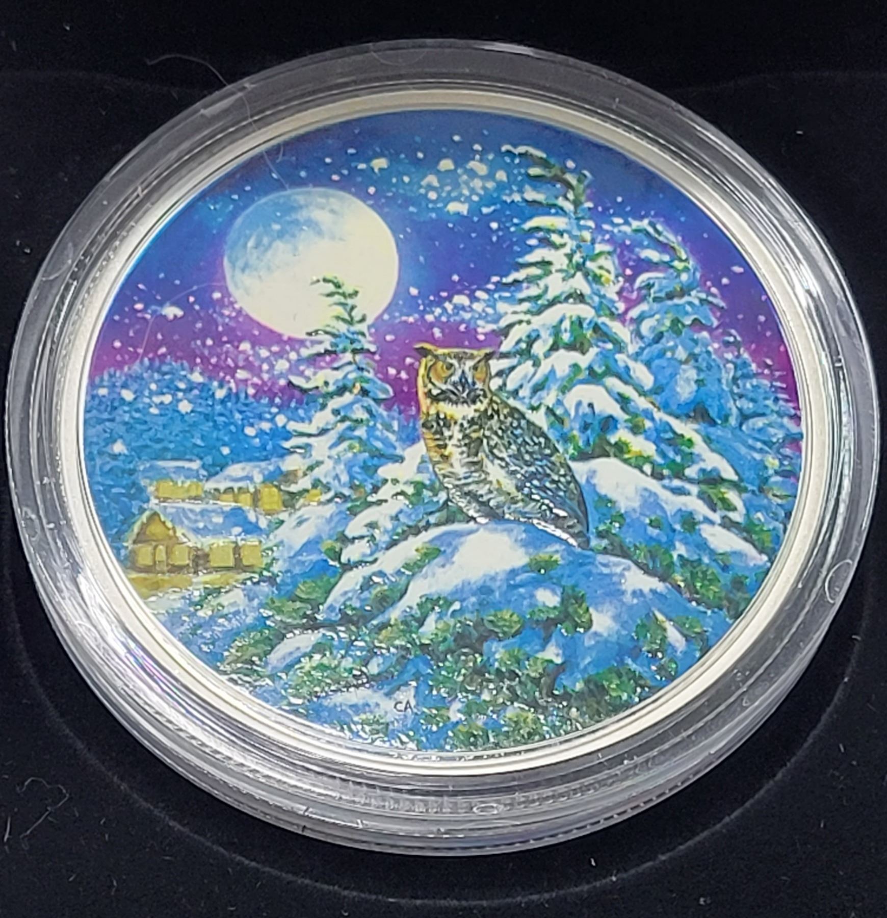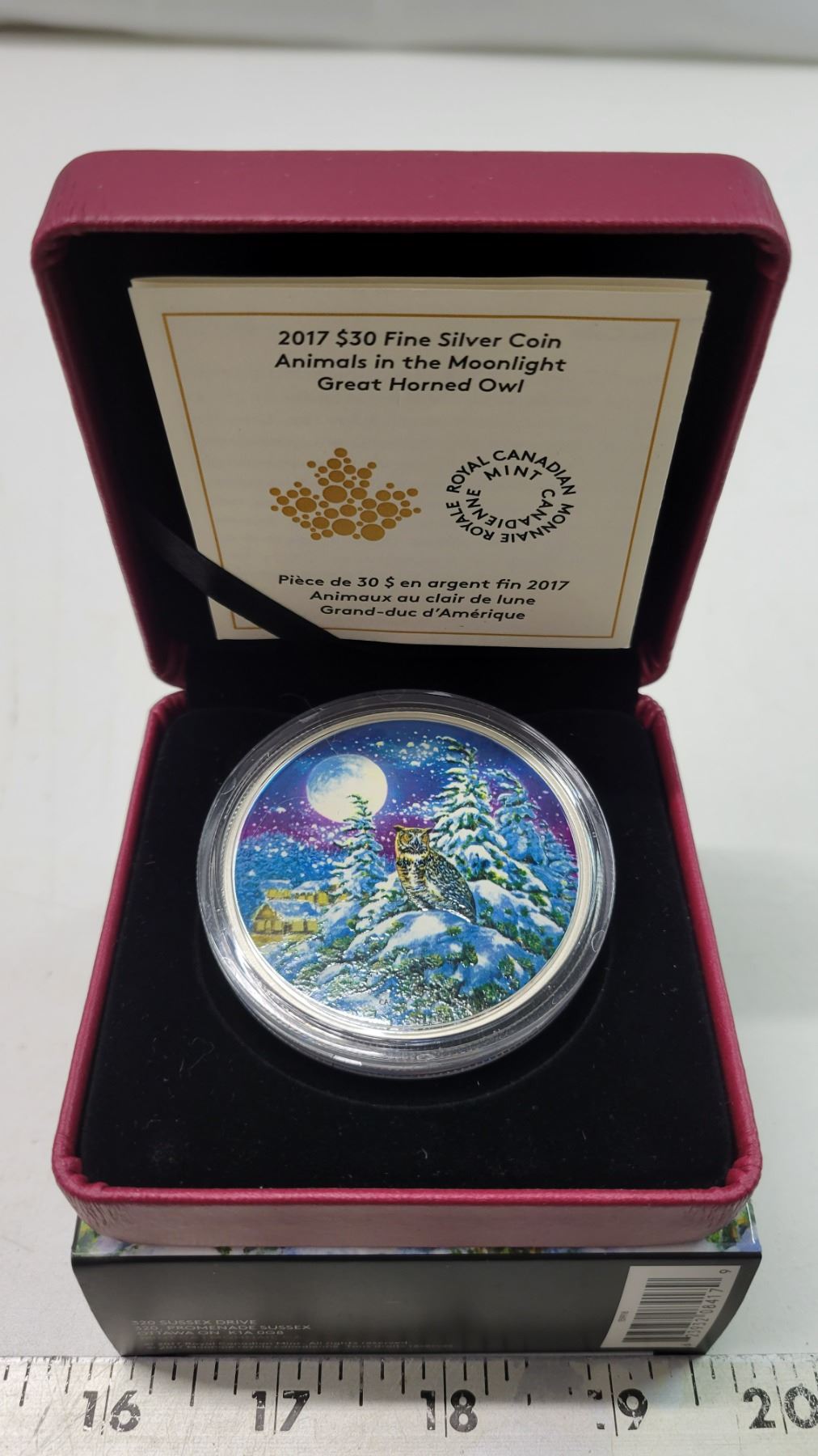 2017 Canada $30 Fine Silver Colored Coin, Animals in the Moonlight: Great Horned Owl, COA