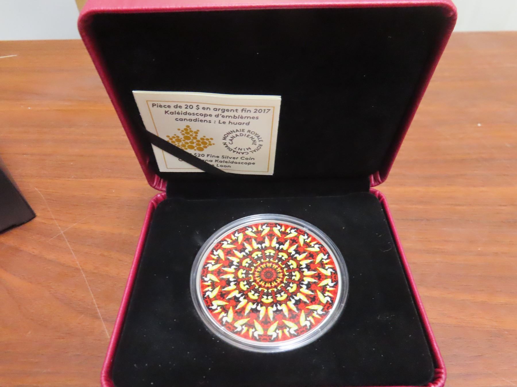 2017 Canadian Kaleidoscope: The Loon $20. Massive 60 mm coin of Coloured Loons. 99.99% pure Silver. Proof with Ultra Heavy Cameo. Housed in its original Royal Canadian Mint case & box of issue. Includes Certificate of Authenticity. Scarce.