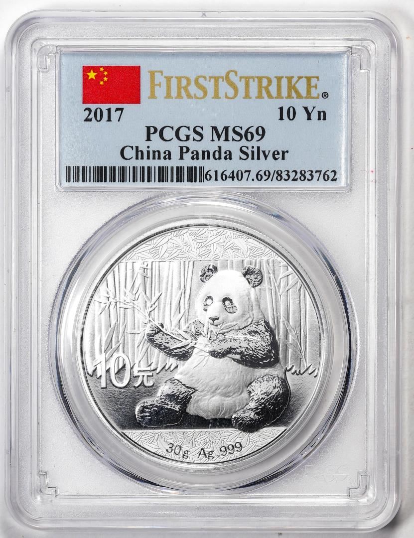 One 2017 China 10 Yuan Silver Panda Coin PCGS MS69 First Strike. PCGS Graded.