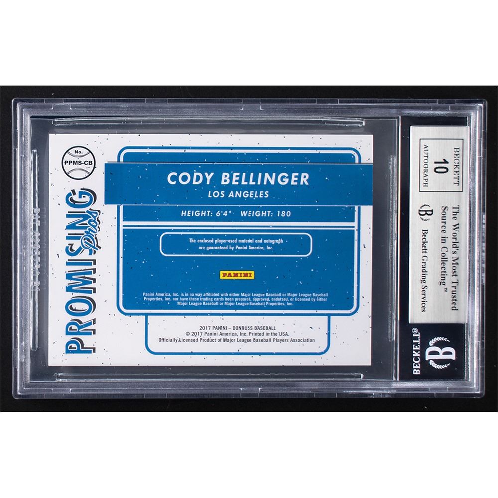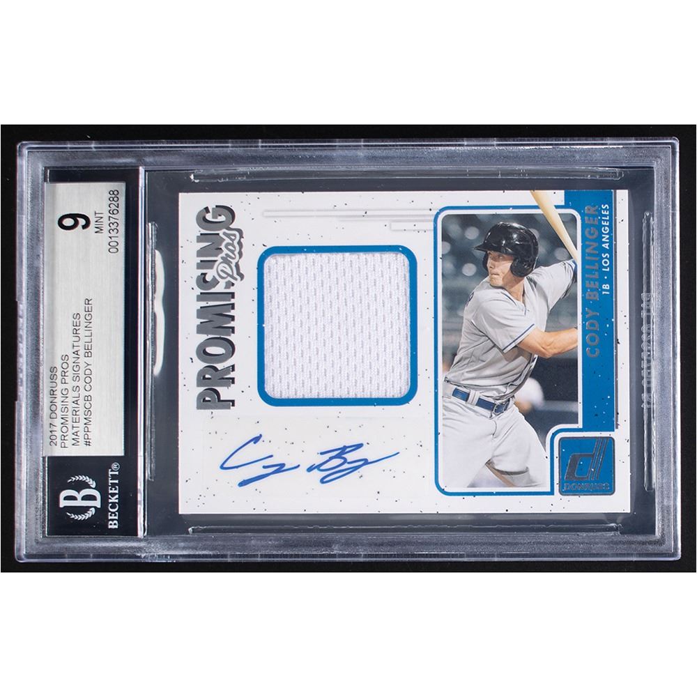 Graded by BGS MINT 9, with an autograph grade of 10. Nice autographed player-used relic card of Los Angeles Dodgers first baseman Cody Bellinger, featuring a fine rookie-era signature and a white swatch of uniform material. Within his first three big league seasons, Bellinger would take home Rookie of the Year honors and a National League MVP Award.
