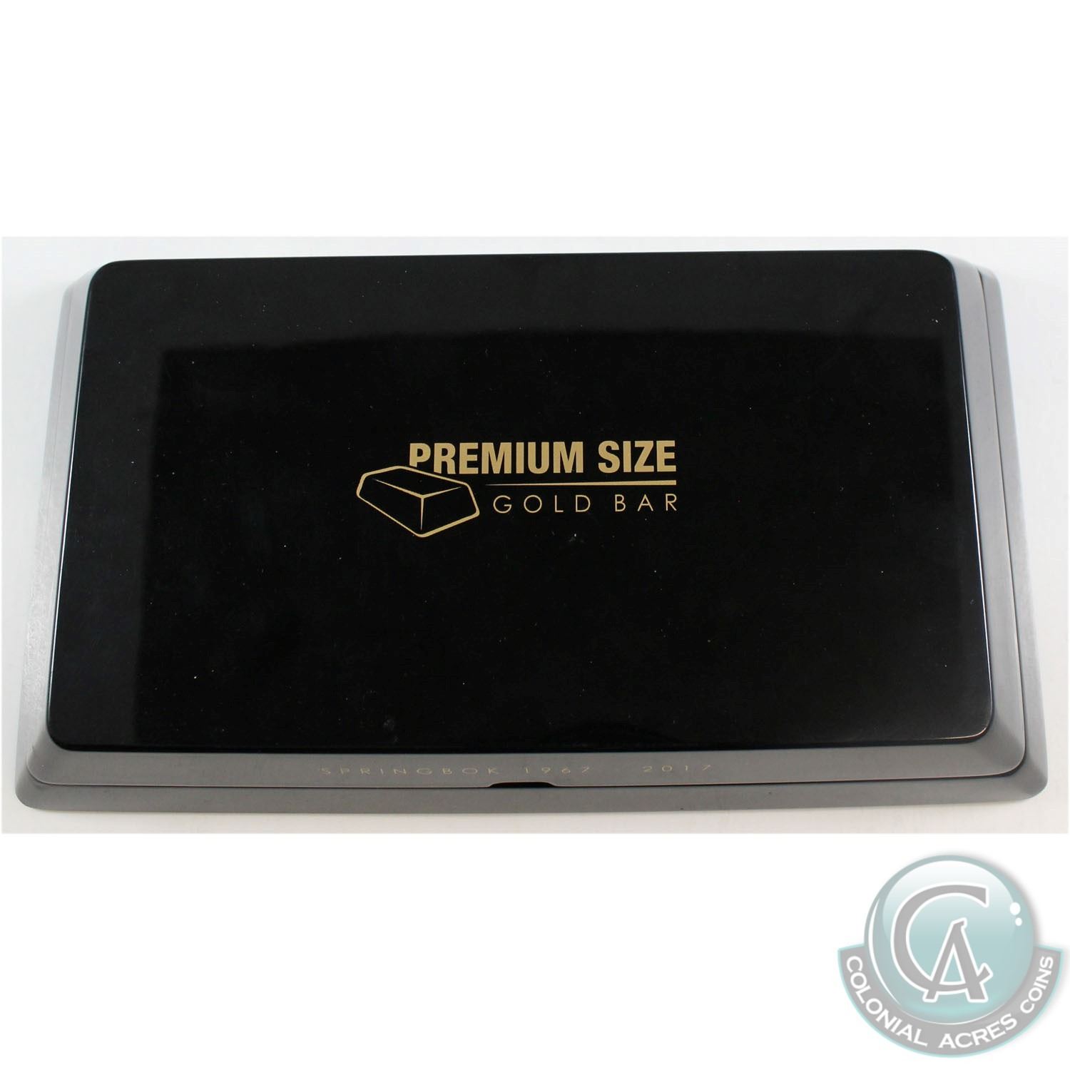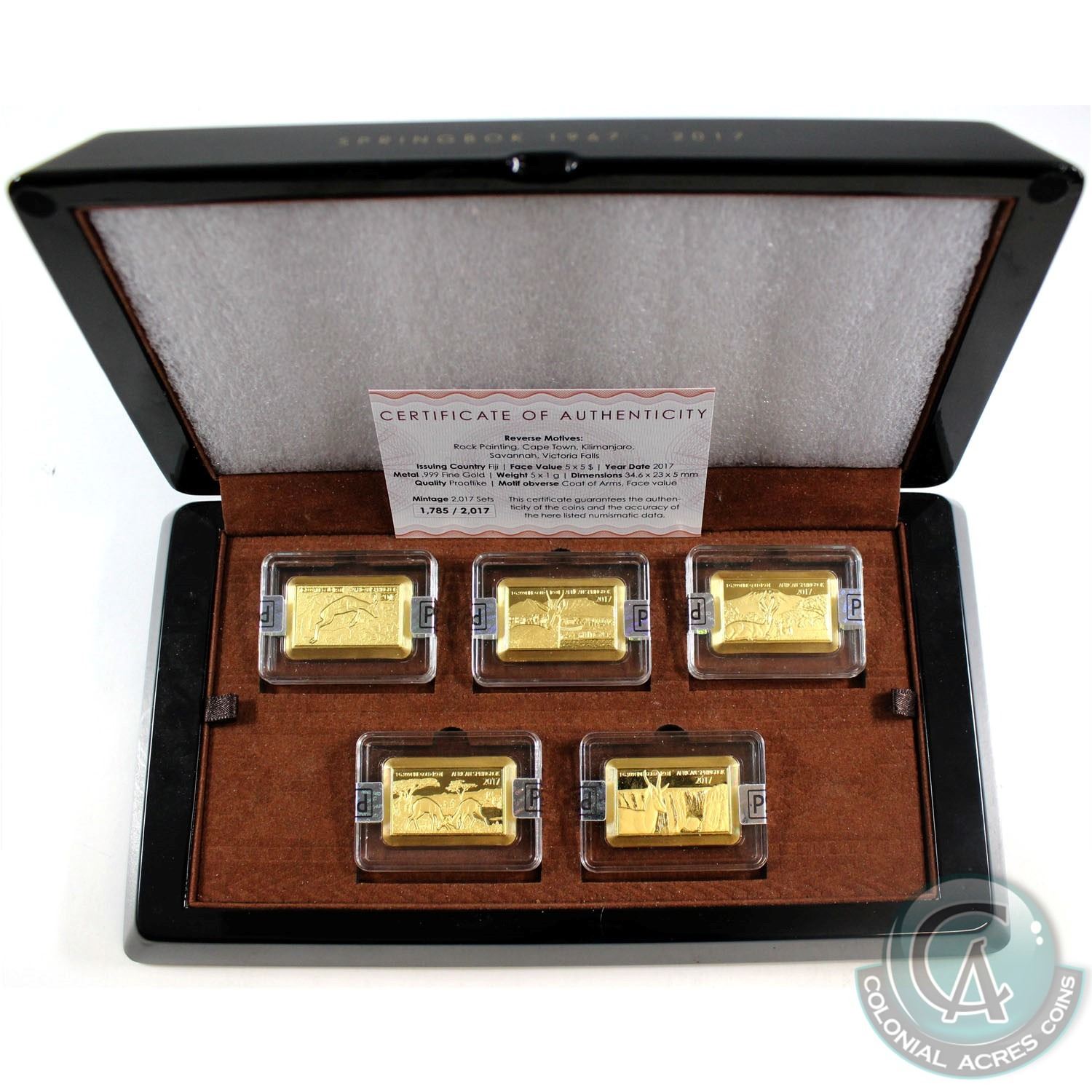2017 Fiji 1-gram Fine Gold Bar 5-Coin South African Springbok Set (Tax Exempt). Bars come with intact PSGB Seals and housed in the mint released clamshell case with COA.