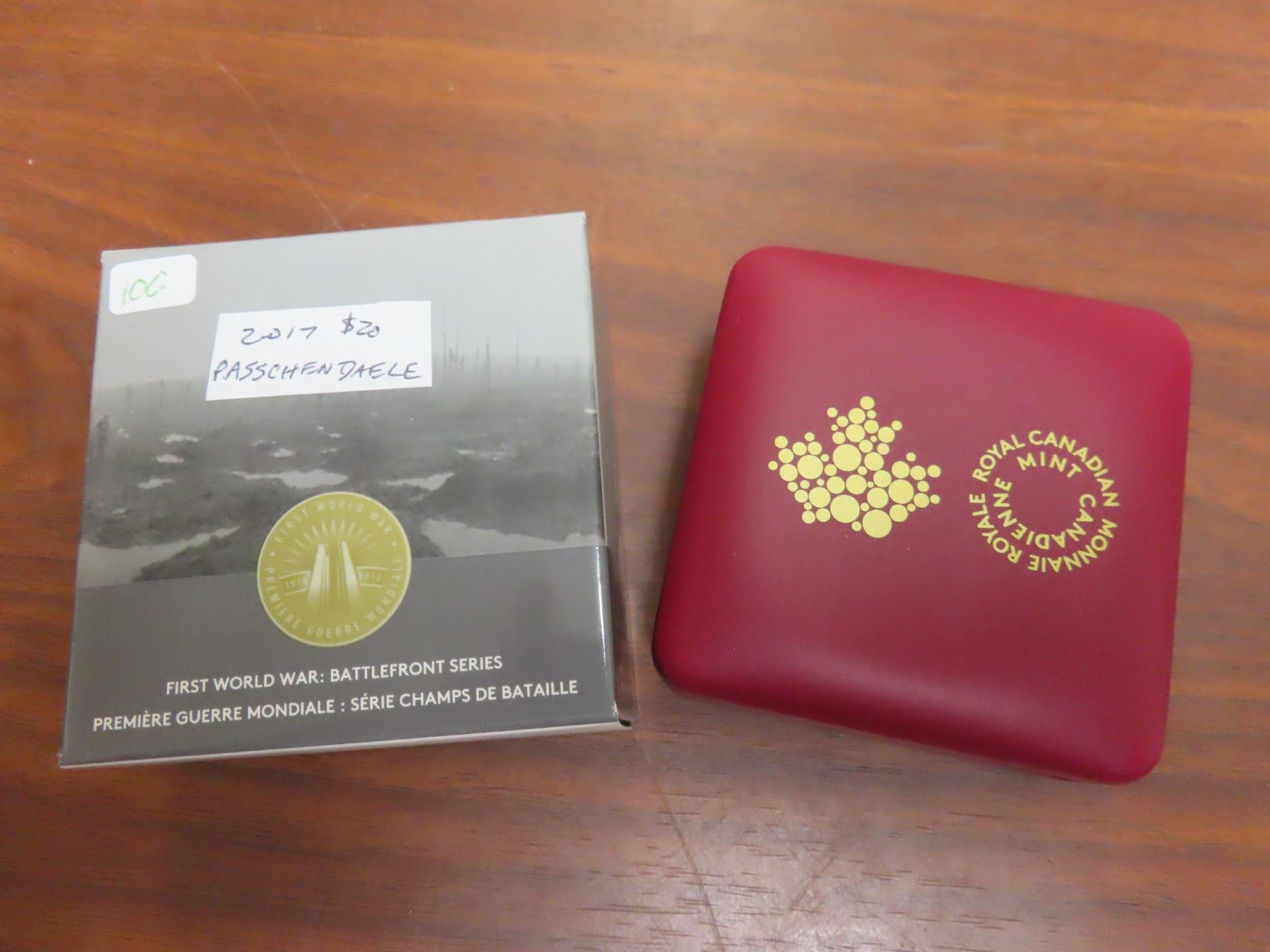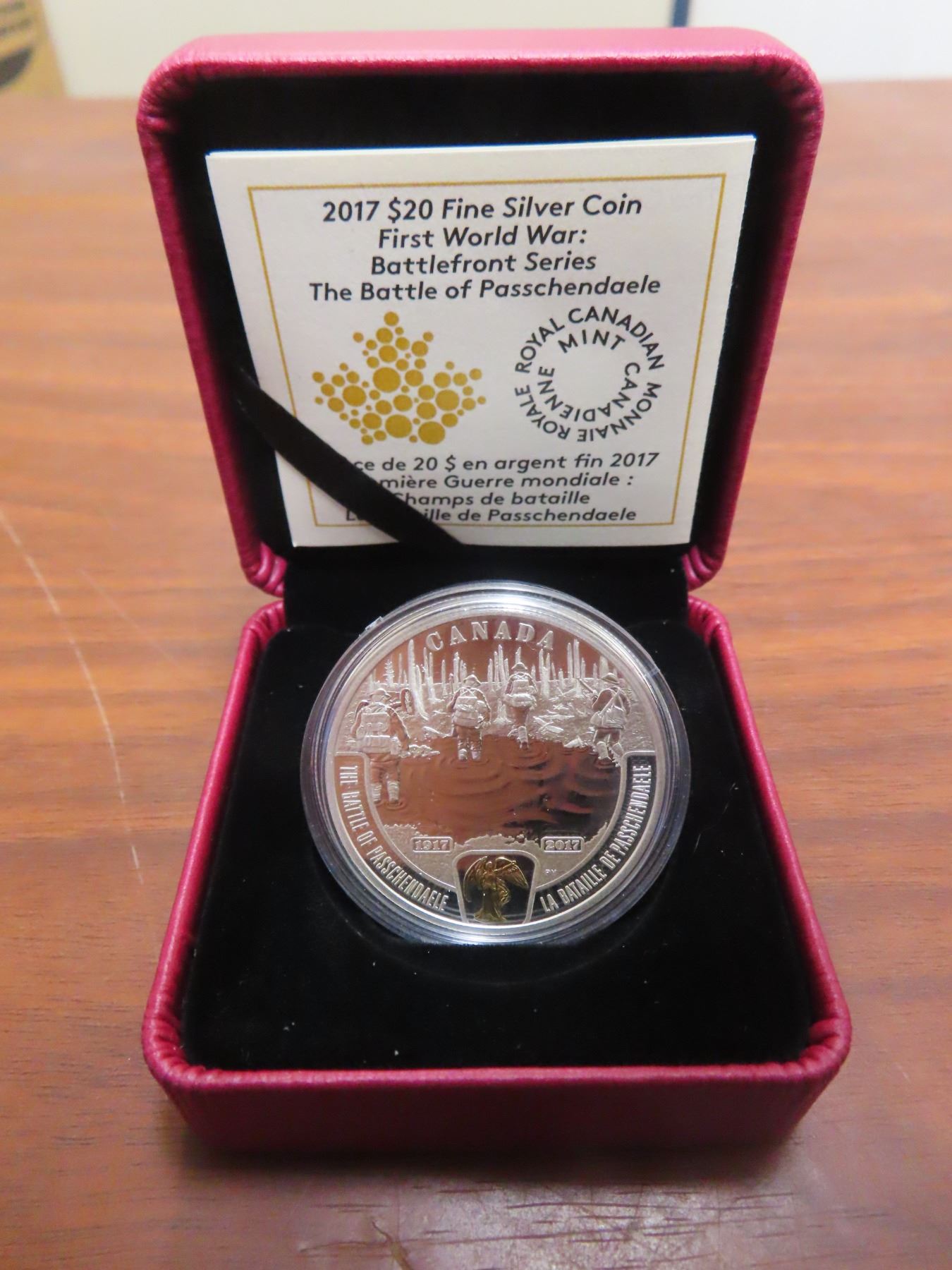 2017 First World War Battlefront Series: The Battle of Passchendaele $20. 99.99% pure Silver with gold plating. Proof with Ultra Heavy Cameo. Housed in its original Royal Canadian Mint case & box of issue. Includes Certificate of Authenticity.