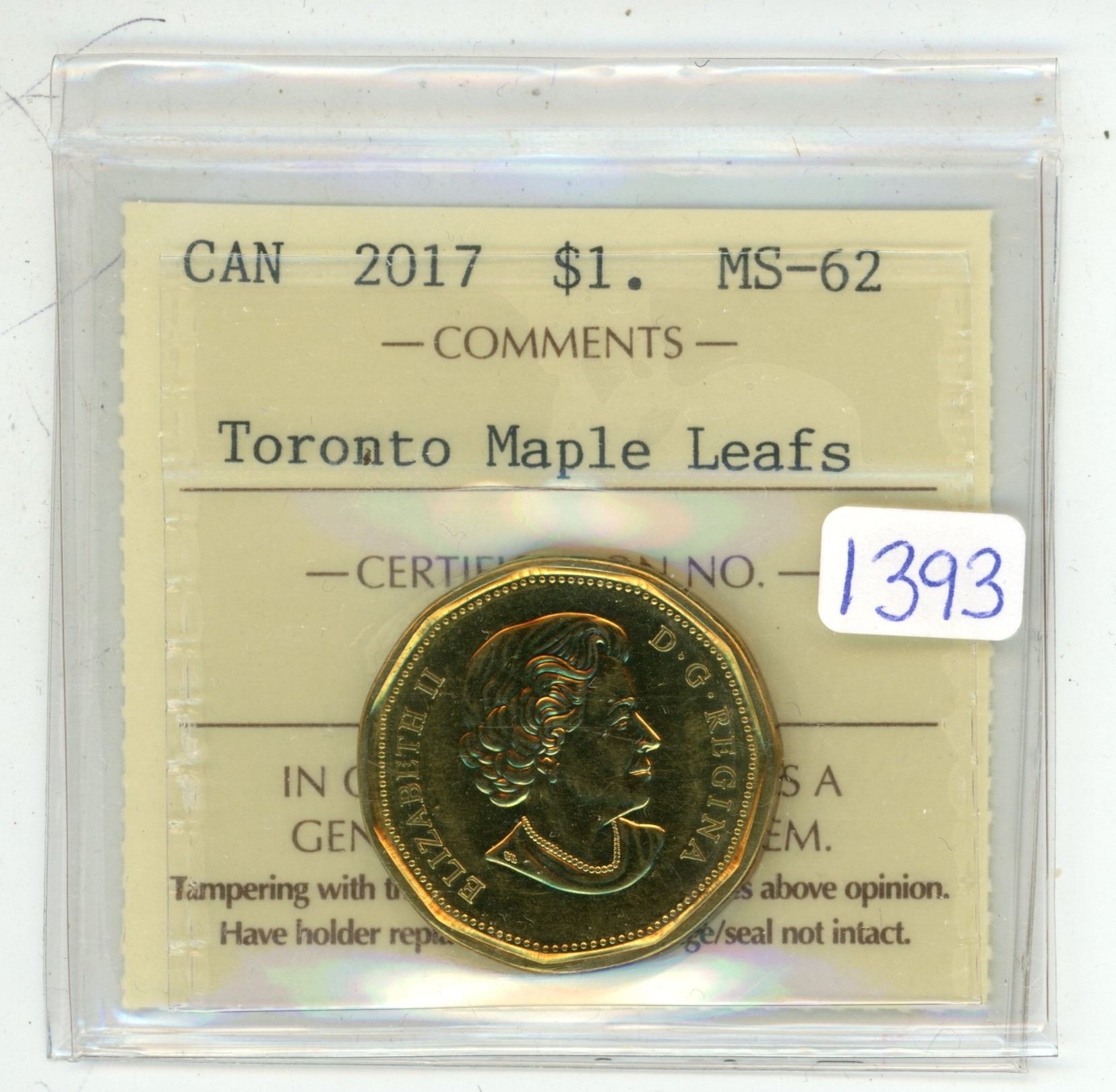 2017 ICCS graded, Toronto Maple Leaf's" Canadian 1 dollar loonie coin - MS62
