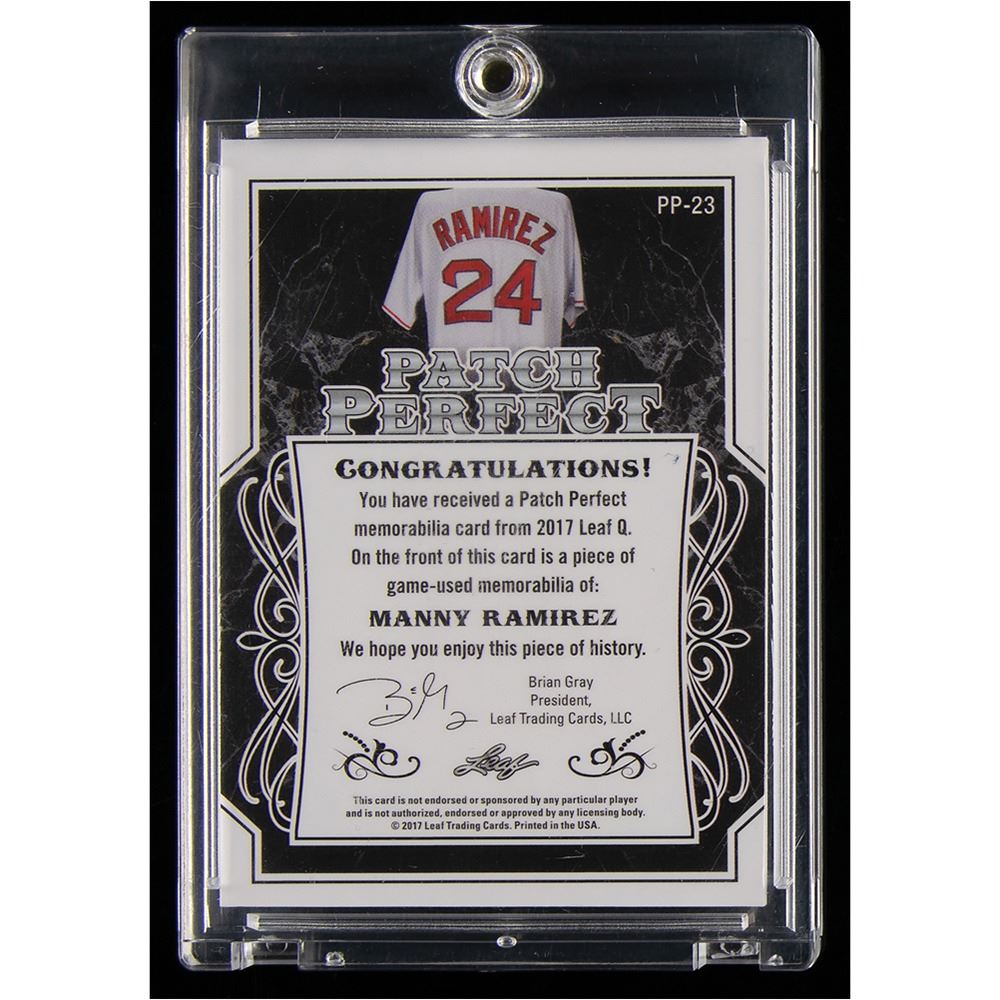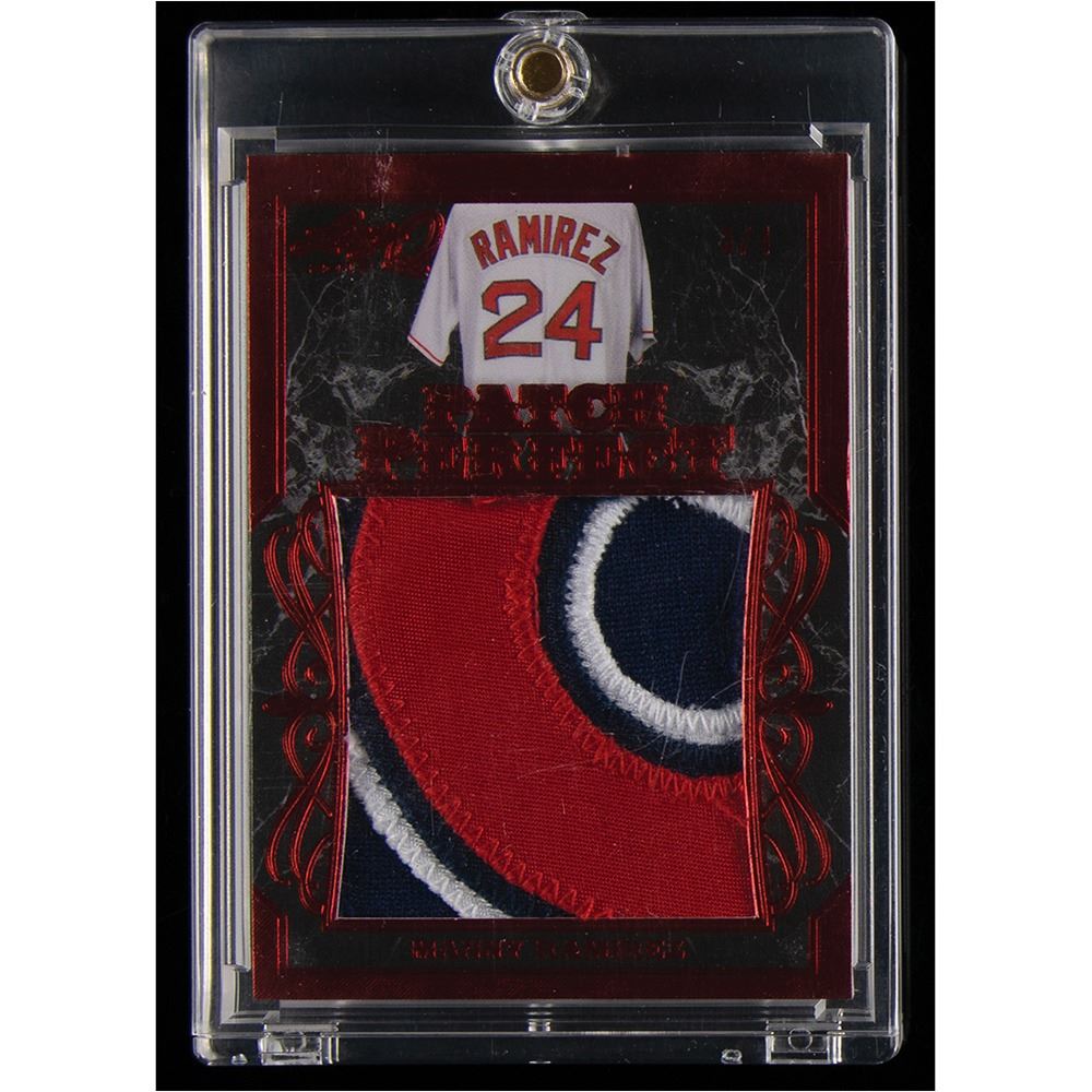 Amazing jumbo game-worn patch card of legendary Boston Red Sox left fielder Manny Ramirez, numbered 3/4, featuring a huge four-color swatch from a game-used jersey. Over the course of Manny's great 19-year career, he racked up 555 home runs, 12 All-Star appearances, and a World Series MVP Award.