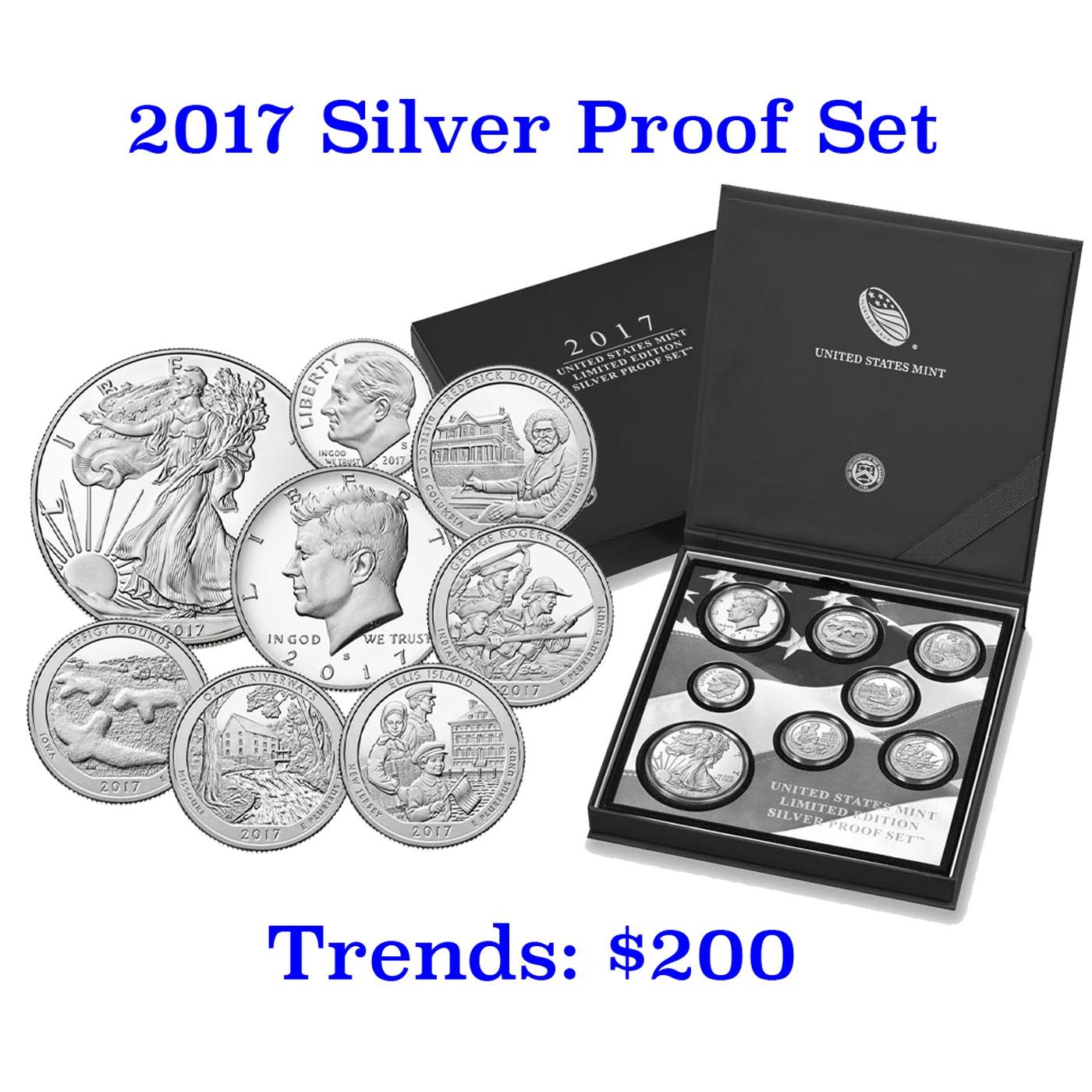 2017 Limited Edition Silver Proof Set . The 2017 United States Mint Limited Edition Silver Proof Set contains eight coins with stunning proof finishes. The coins included in this set are: (1) American Eagle One Ounce Silver Proof Coin with the “S” mint mark (5) Quarters from the America the Beautiful Quarters Program honoring Effigy Mounds National Monument in Iowa; Frederick Douglass National Historic Site in the District of Columbia; Ozark National Scenic Riverways in Missouri; Ellis Island in New Jersey; and George Rogers Clark National Historical Park in Indiana (1) Kennedy half dollar (1) Roosevelt dime The quarters, half dollar, and dime are struck in 90 percent silver, generally referred to as “coin silver.” The American Eagle Silver Proof Coin with the “S” mint mark is a collector version of the official United States Mint American Eagle Silver Bullion Coin and contains one troy ounce of 99.9 percent fine silver. The classic Walking Liberty design by Adolph A. Weinman, features a full-length figure of Liberty in full stride, enveloped in folds of the flag, with her right hand extended and branches of laurel and oak in her left. Inscriptions are "LIBERTY," "IN GOD WE TRUST," and "2017". Countians over 1.25Oz of Pure silver
