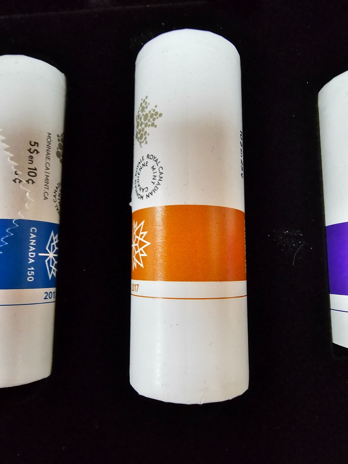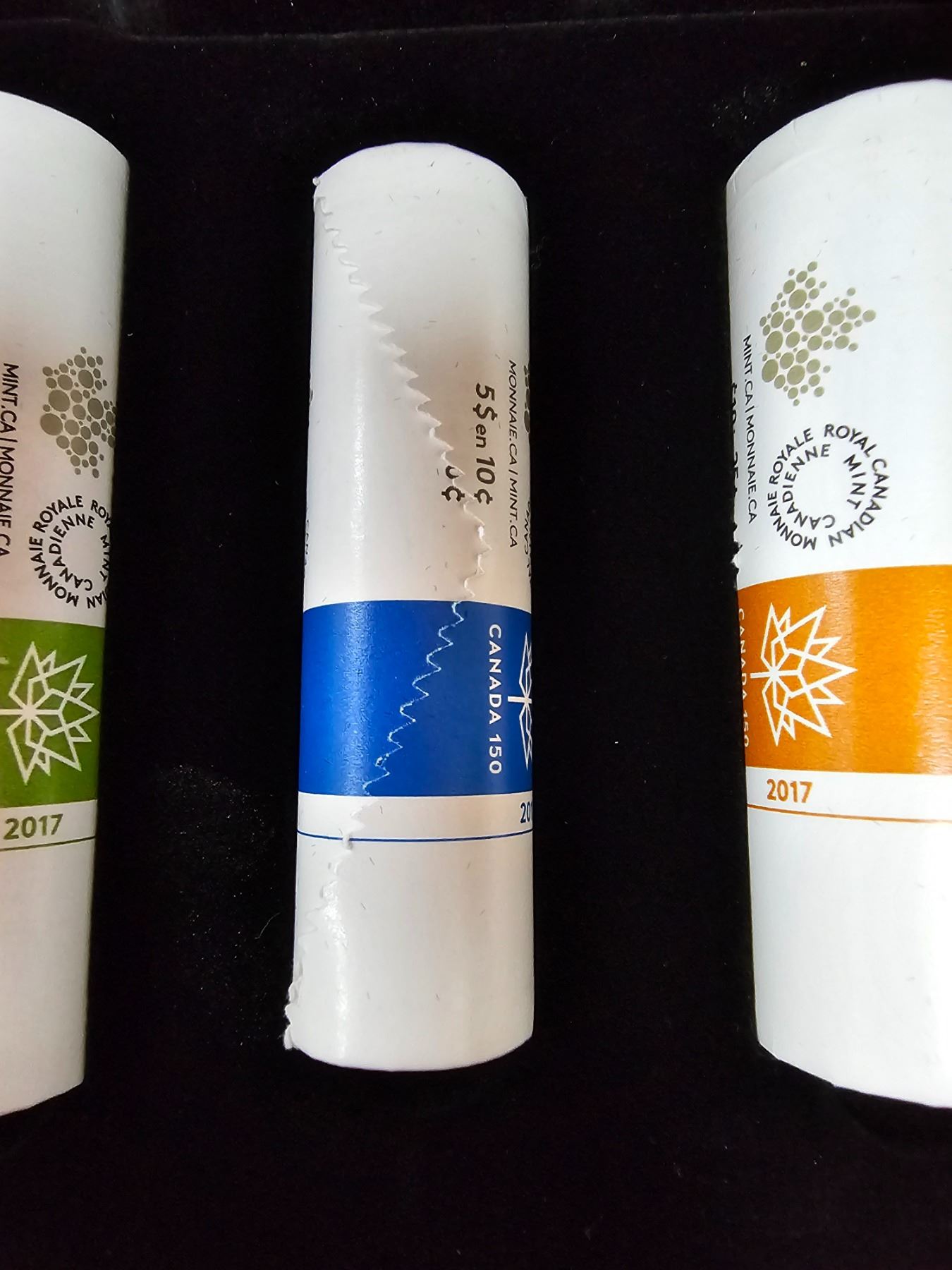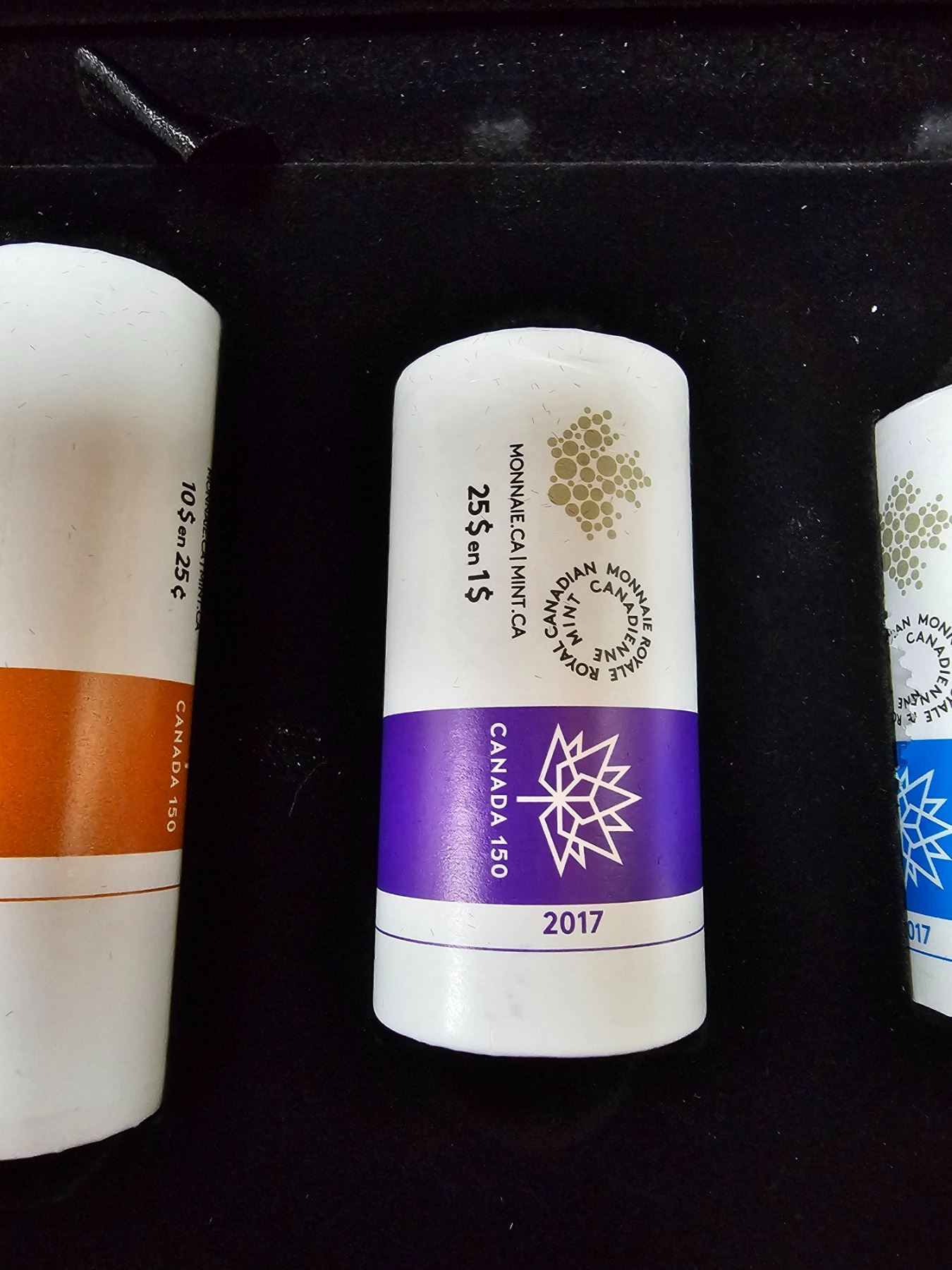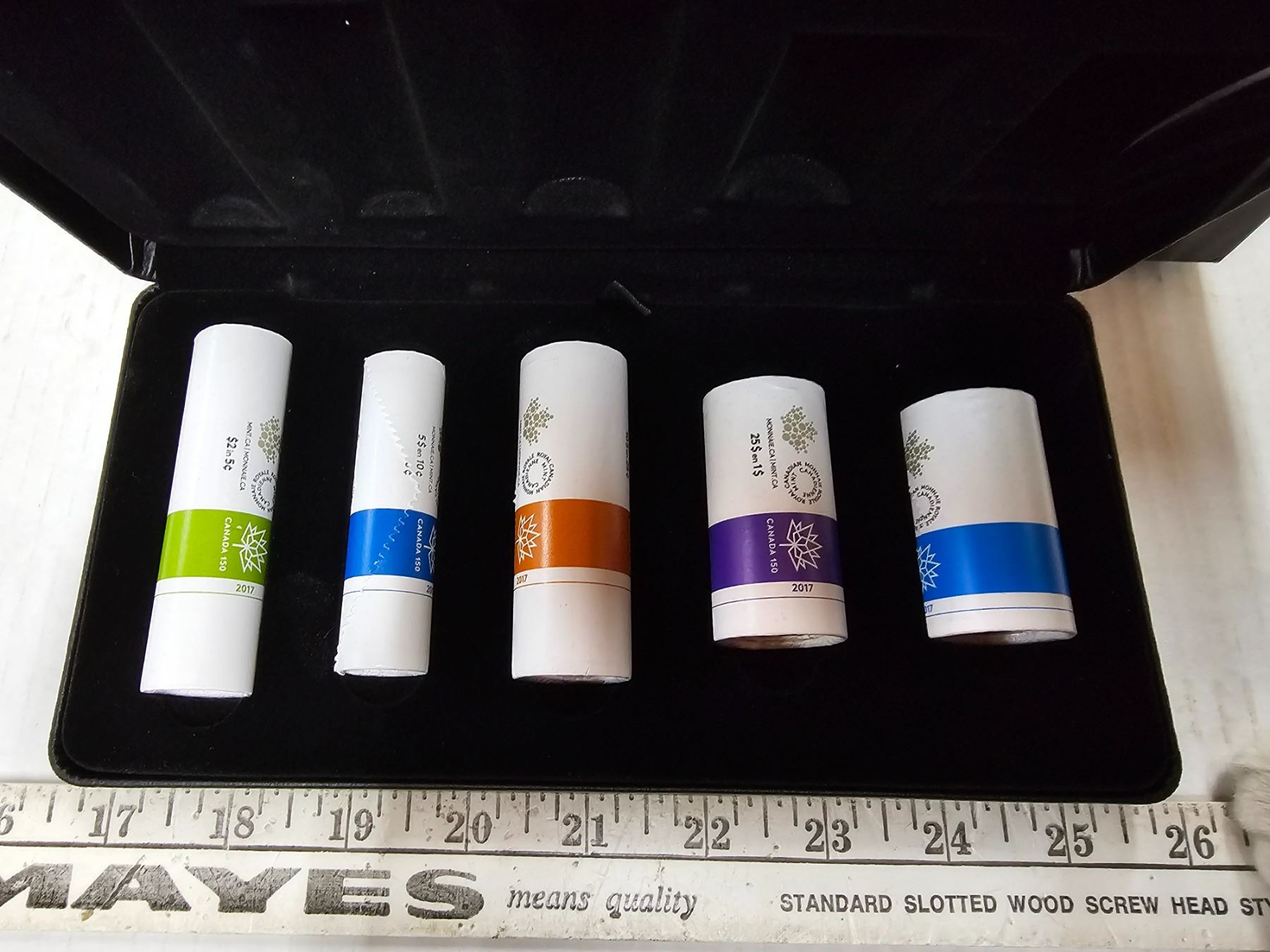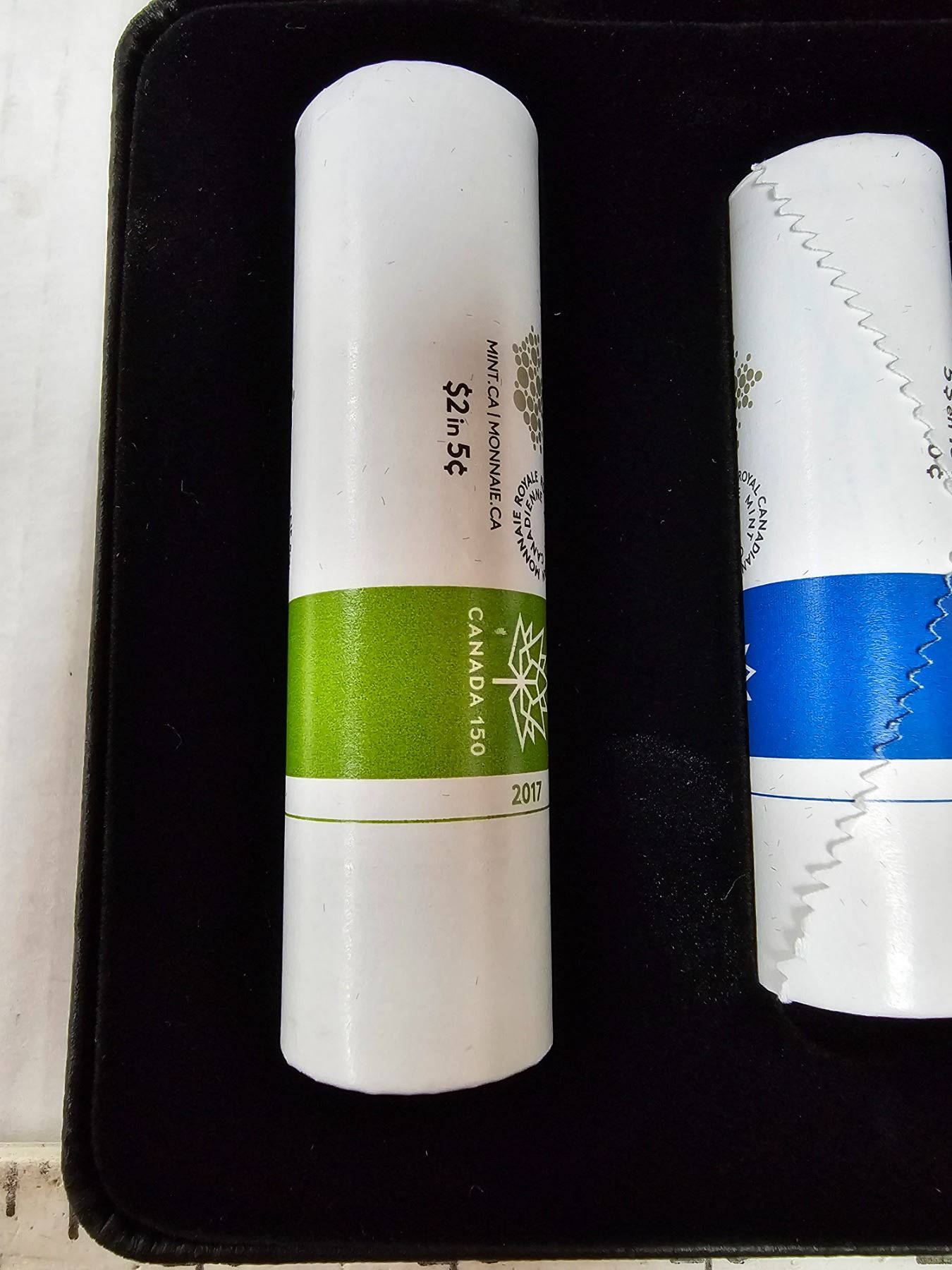 2017 My canada, my inspiration special wrap roll collection. One special wrap roll of each 2017 denomination: toonies, loonies, 25 cents, 10 cents & 5 centsHoused in its original royal canadian mint case & box of issue, along with a certificate of authenticity. Each toonie is the special dance of the spirits northern lights, the loonie is called connecting a nation(railways), the 25 cents is hope for a green future, the 10 cetns is wings of peace, while the 5 cents is living traditions.