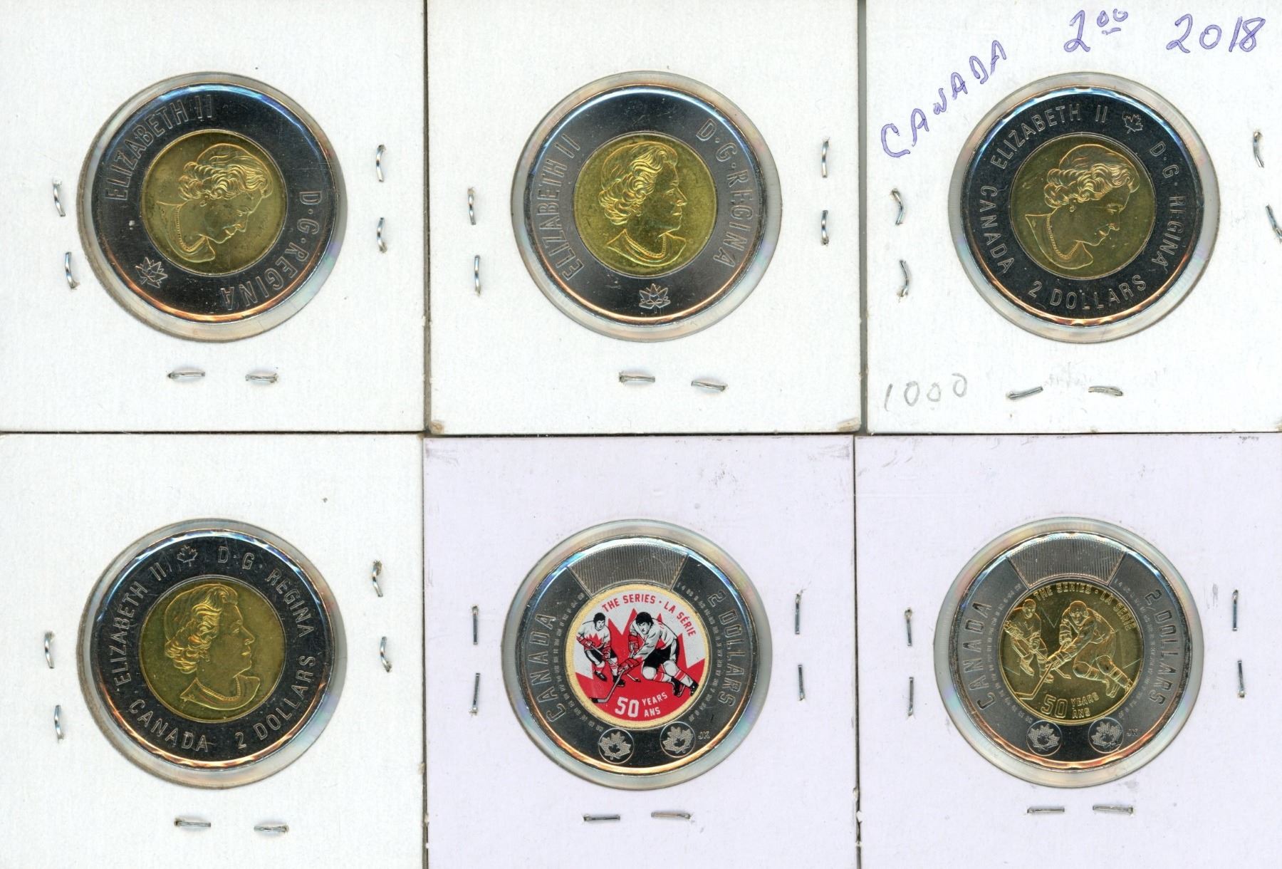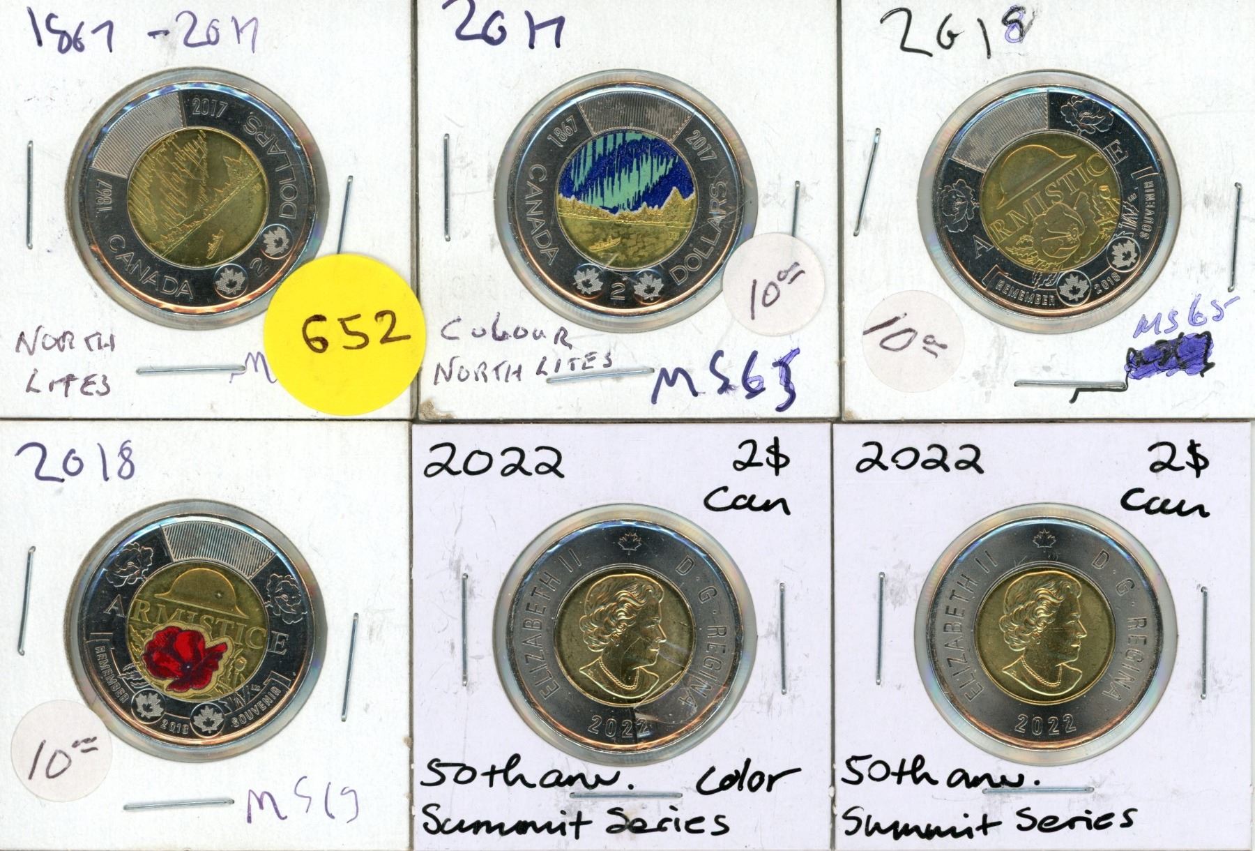 2017 (Northern Lights, No Color and Color), 2018 (Remembrance Day, No Color and Color), 2022 (Summit S. 50th Anv. Color and 50th Anv. No Color) Canadian Two Dollar.