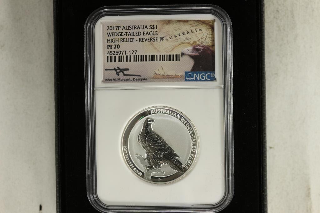REVERSE PROOF SILVER DOLLAR NGC PF70 WITH JOHN M. MERCANTI SIGNATURE IN ORIGINAL PERTH MINT PACKAGING
