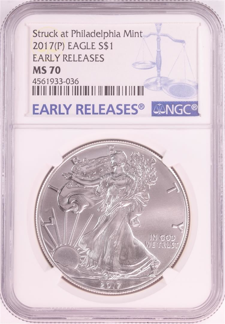 One 2017(P) Philadelphia Mint $1 American Silver Eagle Coin NGC MS70 Early Releases. NGC Certified.