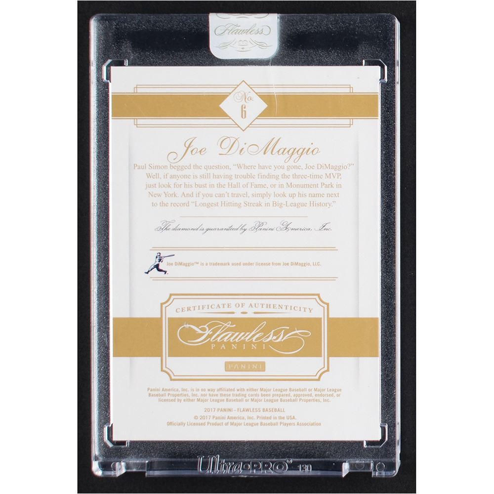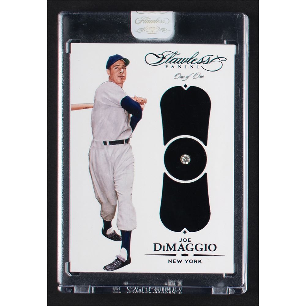 Factory sealed in its Panini Flawless holder. Magnificent one-of-one card of New York Yankees Hall of Famer Joe DiMaggio, numbered 1/1, featuring a small embedded diamond gemstone. A stunning and unique card of Joltin' Joe.