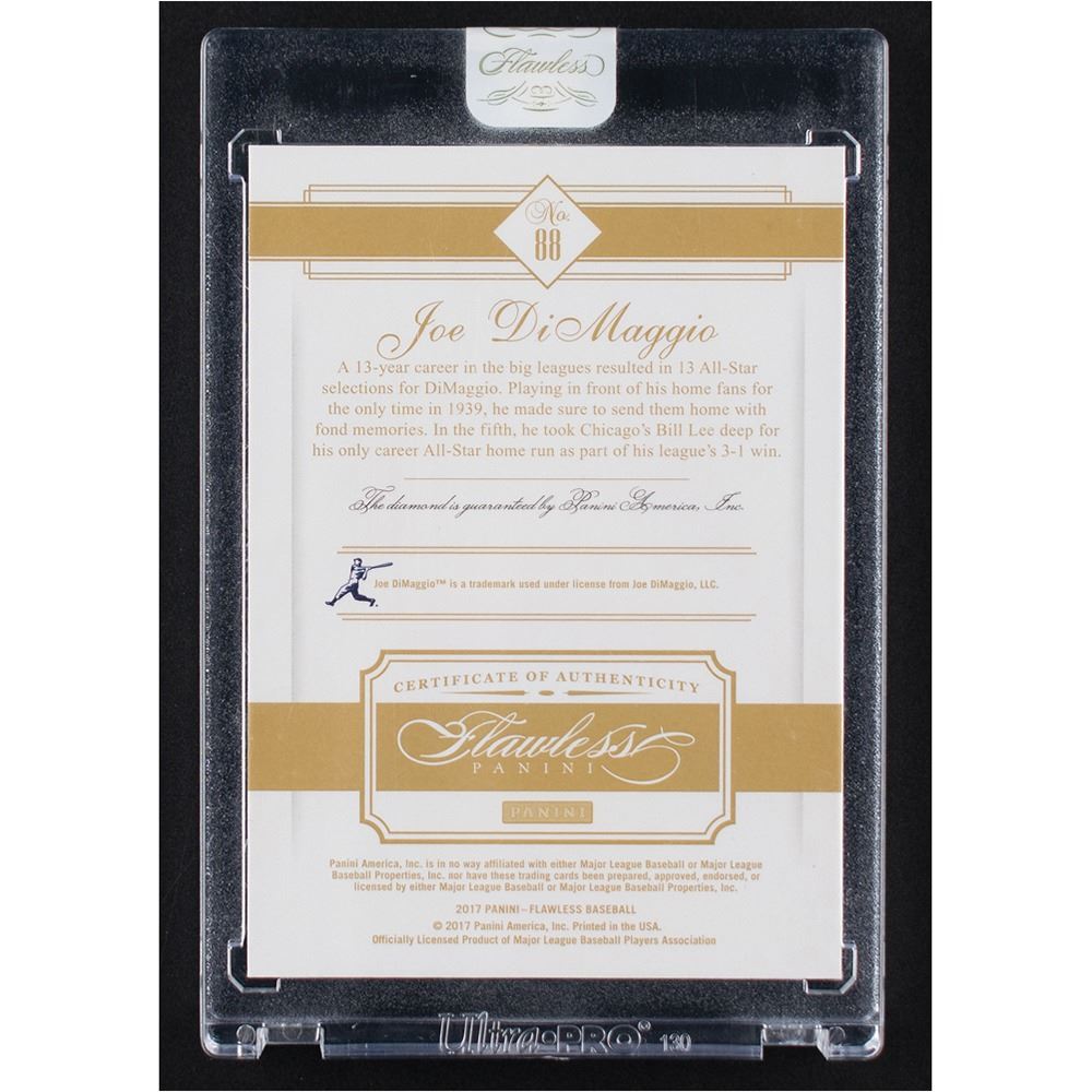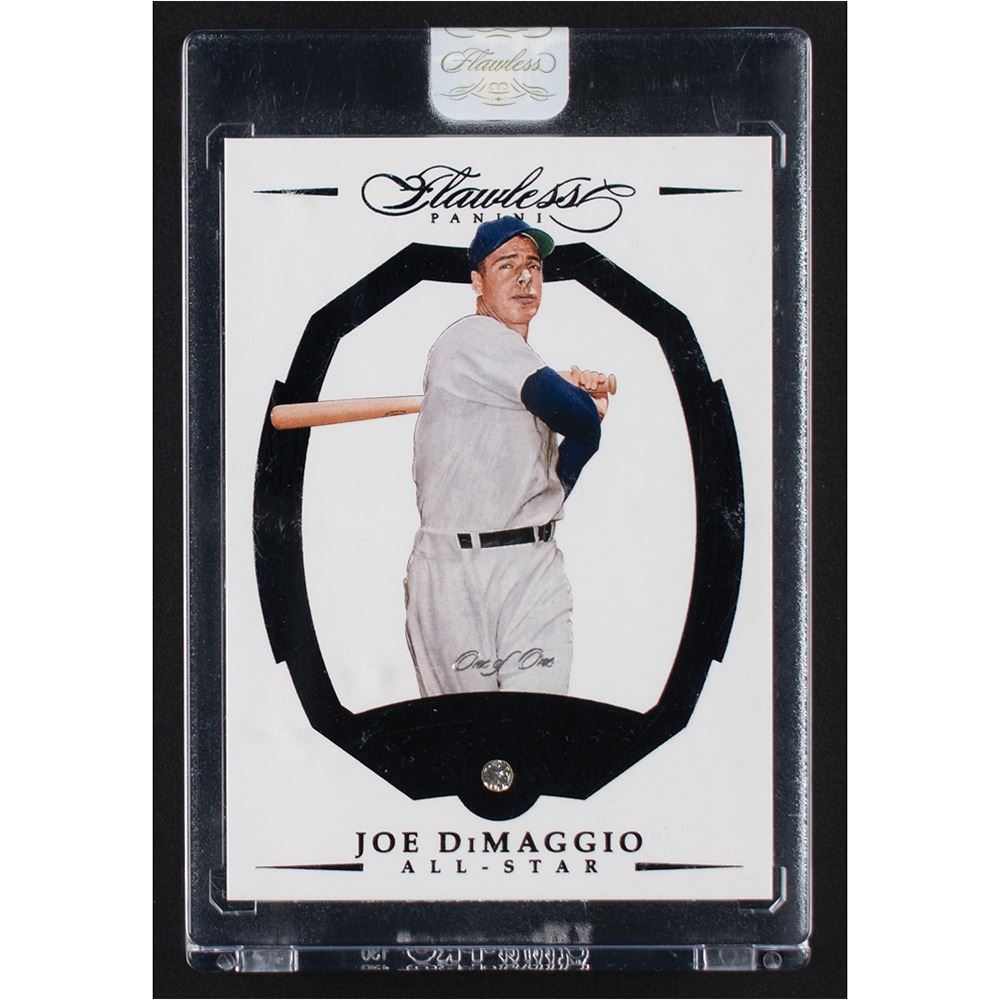 Factory sealed in its Panini Flawless holder. Rare and unique one-of-one card of New York Yankees All-Star outfielder Joe DiMaggio, numbered 1/1, boasting a small embedded diamond. A highly appealing card of the 'Yankee Clipper,' who made the All-Star squad in every season throughout his 13-year career.