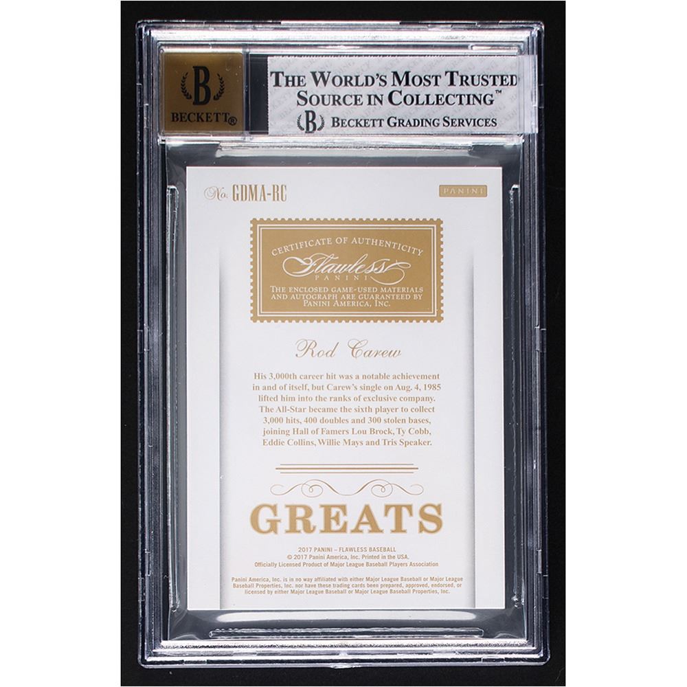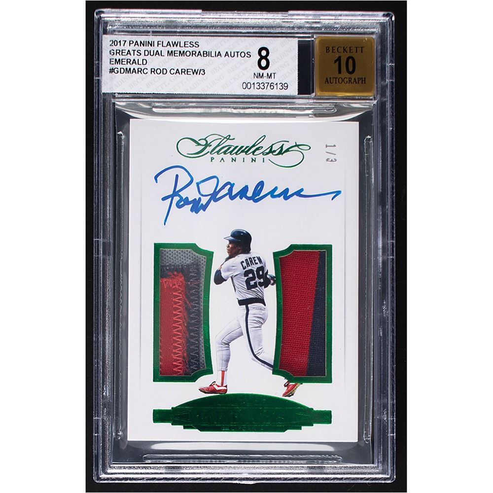 Graded by BGS NM-MT 8, with an autograph grade of 10. Outstanding autographed dual game-worn patch card of California Angels hitter Rod Carew, numbered 1/3, featuring a perfectly bold signature and two nice multi-color patches. A superb signed relic card of the 18-time All-Star and first-ballot Hall of Famer.