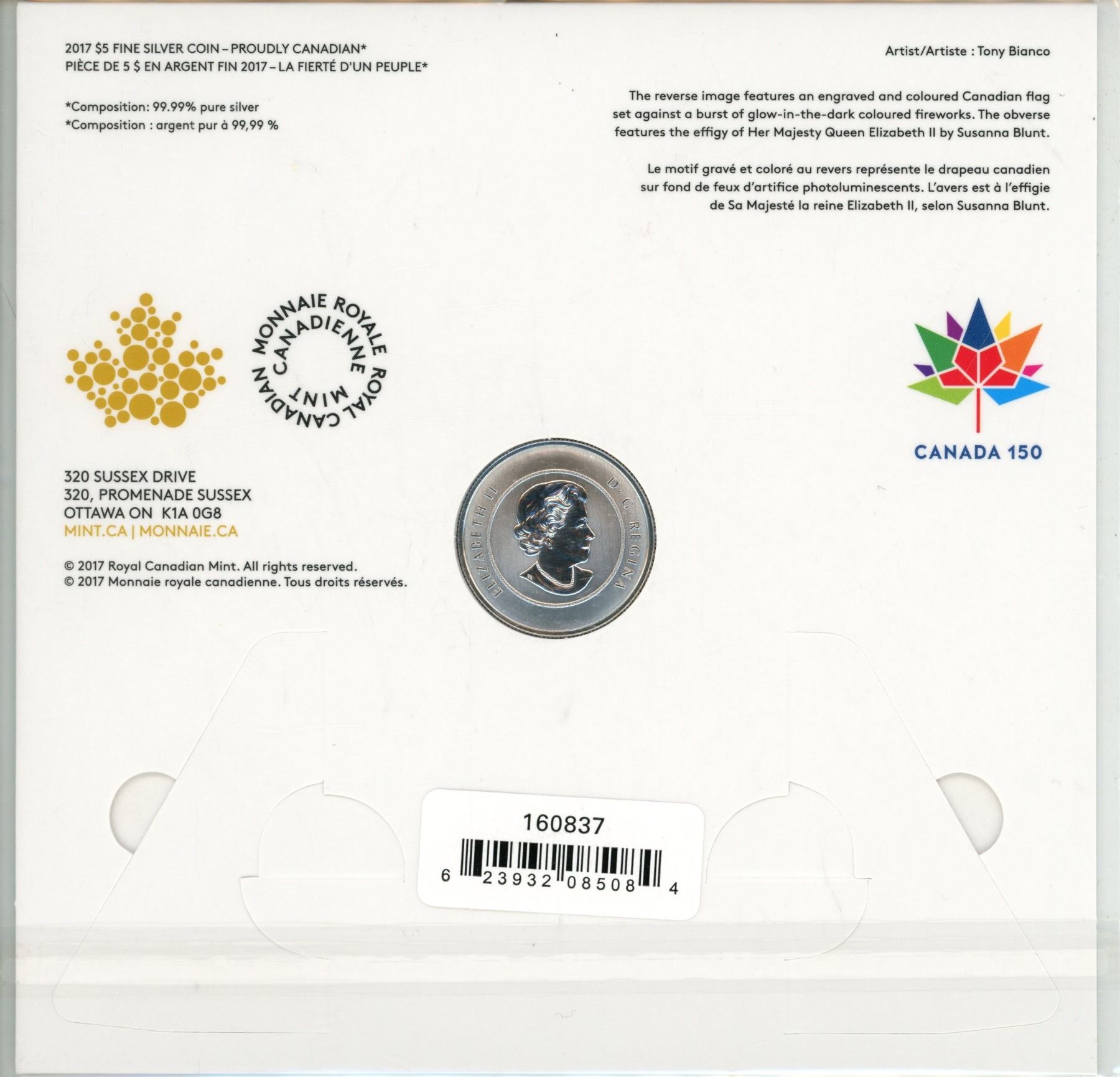 2017 Proudly Canadian $5 Fine Silver Coin - 99.99% Pure Silver.