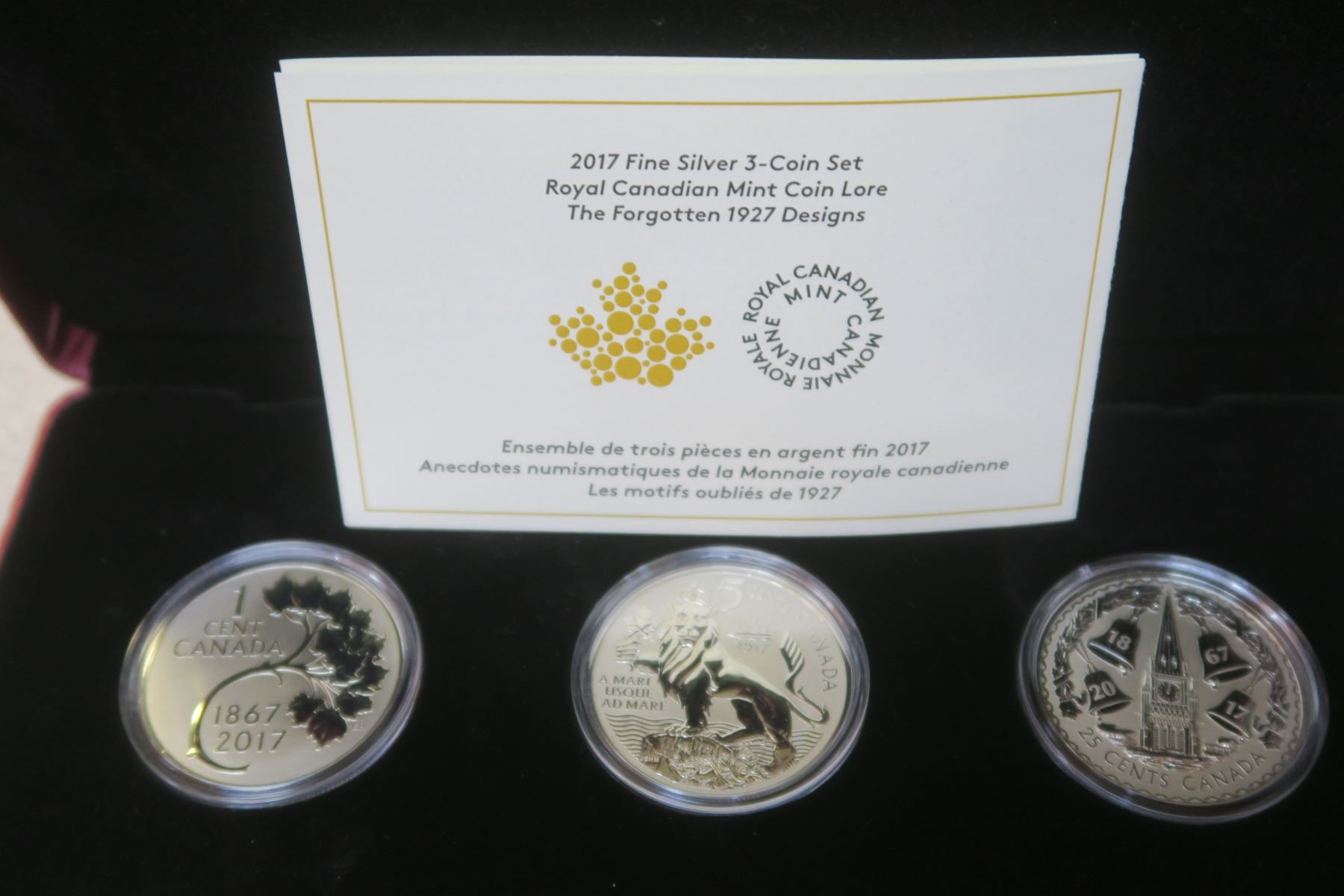 2017 Set of 3 Royal Canadian Mint Coin Lore: The Forgotten 1927 Designs: The Coins That Never Were. Emanuel Hahn designs for 1927 includes 1 Cent, 5 Cents & 25 Cents. 99.99% pure Silver. Mintage of 5,500. Scarce.