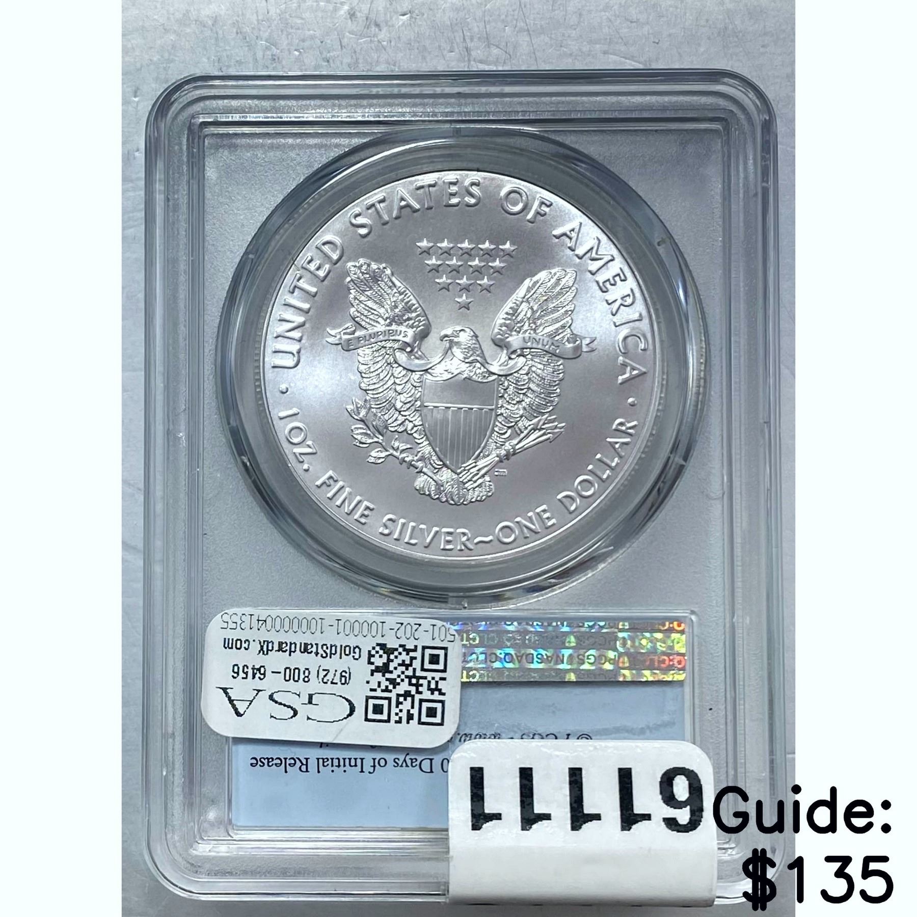 e. Coins sold referencing a third-party grading service are sold “AS IS” without any express or implied warranty, except for a guarantee by GSA that they are genuine. Removal or alteration of the holder, voids all of Bidder’s claims concerning that Product. Certain warranties may be available from the grading services and Bidders are referred to them for further details: Numismatic Guaranty Corporation (NGC), PO Box 4776, Sarasota, FL 34230, www.ngccoin.com/services/writtenguarantee.asp; Professional Coin Grading Services (PCGS), PO Box 9458, Newport Beach, CA 92658, www.pcgs.com/guarantee.html; ANACS, 6555 S. Kenton St., Ste. 303, Englewood, CO 80111; and Independent Coin Grading Co. (ICG), 7901 East Bellview, Ave., Suite 50, Englewood, CO 80111.