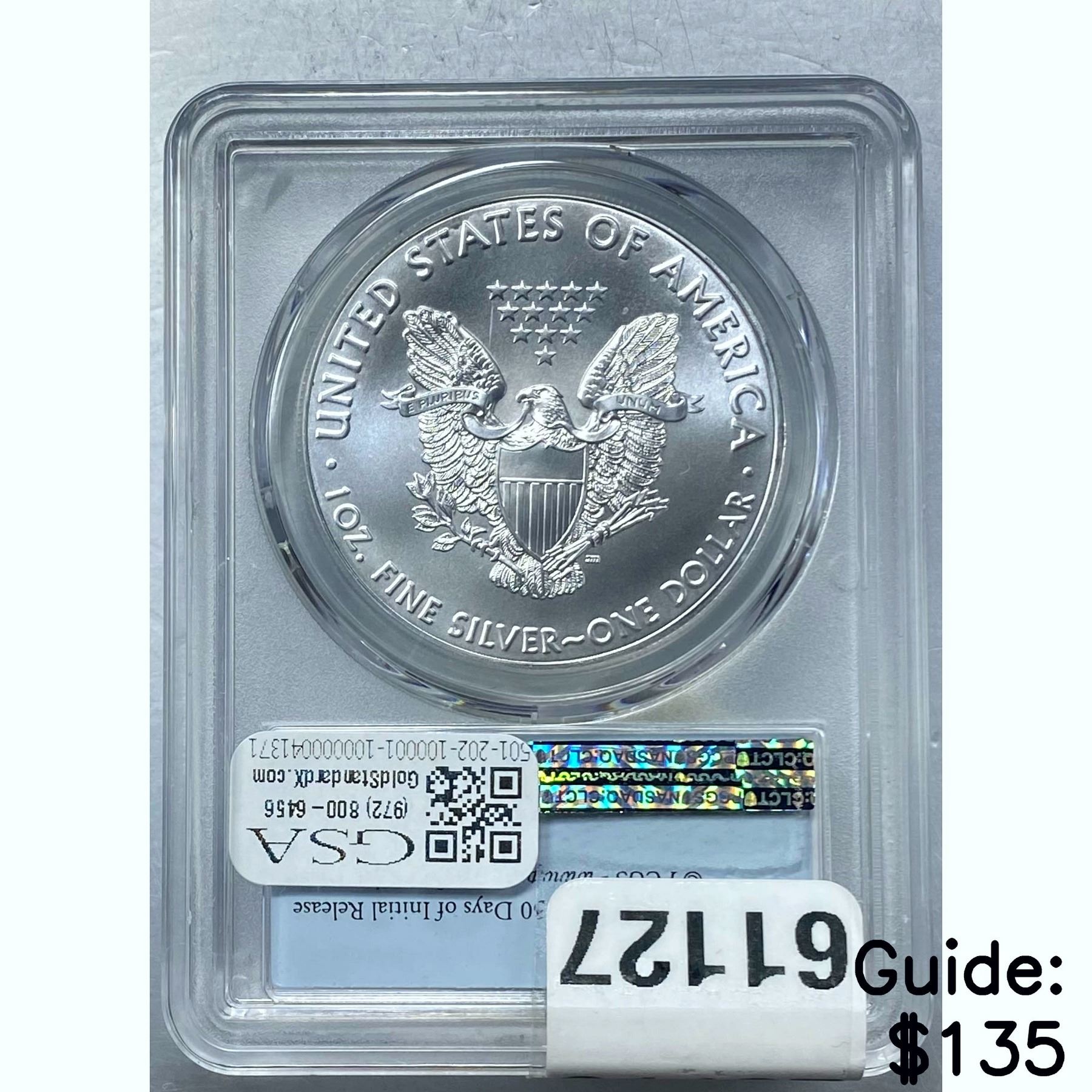 e. Coins sold referencing a third-party grading service are sold “AS IS” without any express or implied warranty, except for a guarantee by GSA that they are genuine. Removal or alteration of the holder, voids all of Bidder’s claims concerning that Product. Certain warranties may be available from the grading services and Bidders are referred to them for further details: Numismatic Guaranty Corporation (NGC), PO Box 4776, Sarasota, FL 34230, www.ngccoin.com/services/writtenguarantee.asp; Professional Coin Grading Services (PCGS), PO Box 9458, Newport Beach, CA 92658, www.pcgs.com/guarantee.html; ANACS, 6555 S. Kenton St., Ste. 303, Englewood, CO 80111; and Independent Coin Grading Co. (ICG), 7901 East Bellview, Ave., Suite 50, Englewood, CO 80111.