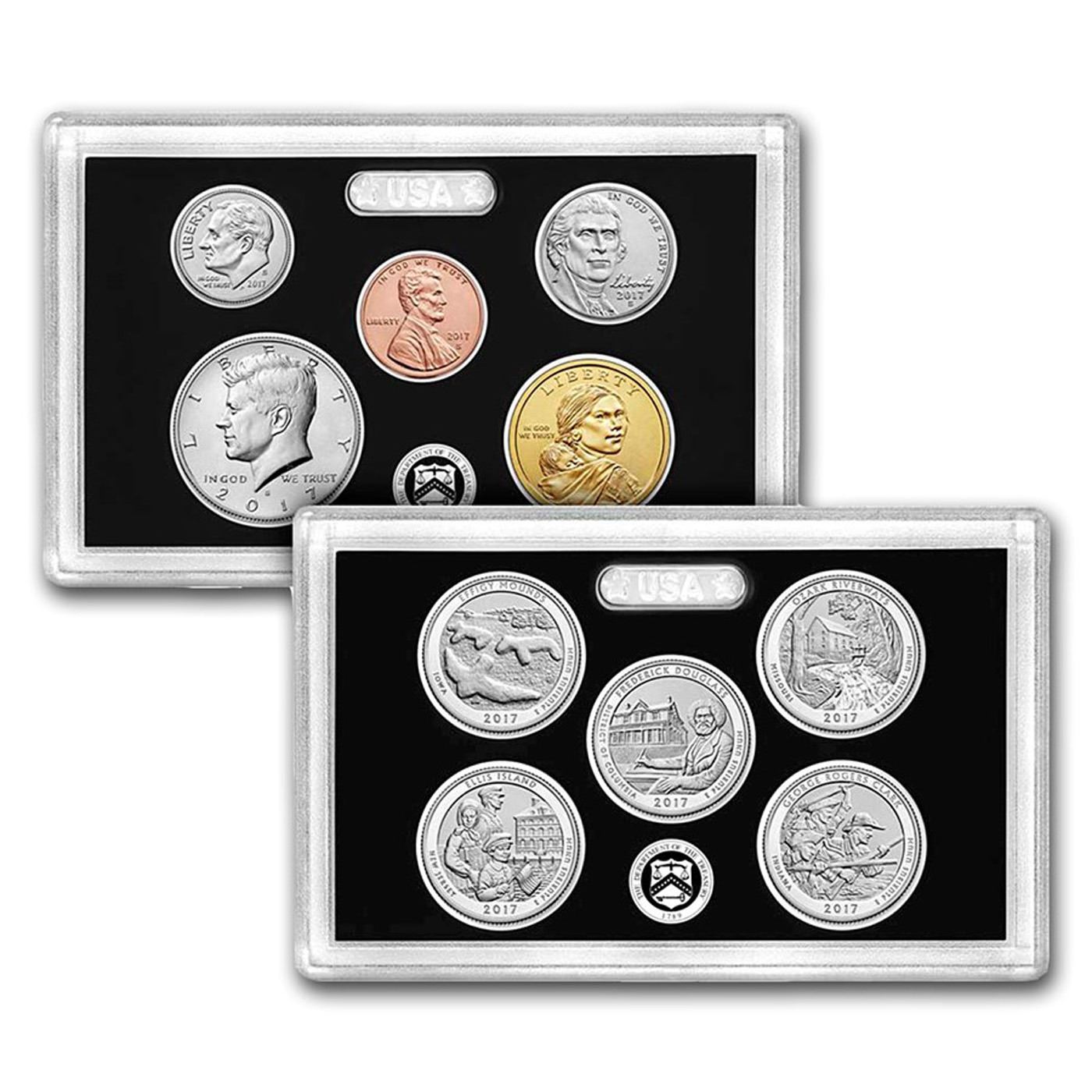 2017 U.S. Mint 225th Anniversary Enhanced Uncirculated Coin Set. For the first time ever, the U.S. Mint has released a set of all 10 circulating U.S. coins in a special Enhanced Uncirculated finish. These coins feature frosted devices on an unpolished field giving them a unique visual appeal. First ever Enhanced Uncirculated set from the U.S. Mint! Limited to 225,000 sets. Each set is housed in the original mint packaging. This set features the following coins: Native American Dollar, Kennedy Half Dollar, Roosevelt Dime, Jefferson Nickel, and Lincoln Cent. Also includes the following ATB Quarters: Effigy Mounds National Monument, Frederick Douglass National Historic Site, Ozark National Scenic Riverways, Ellis Island National Monument, and George Rogers Clark National Historic Park. All coins minted in San Francisco.