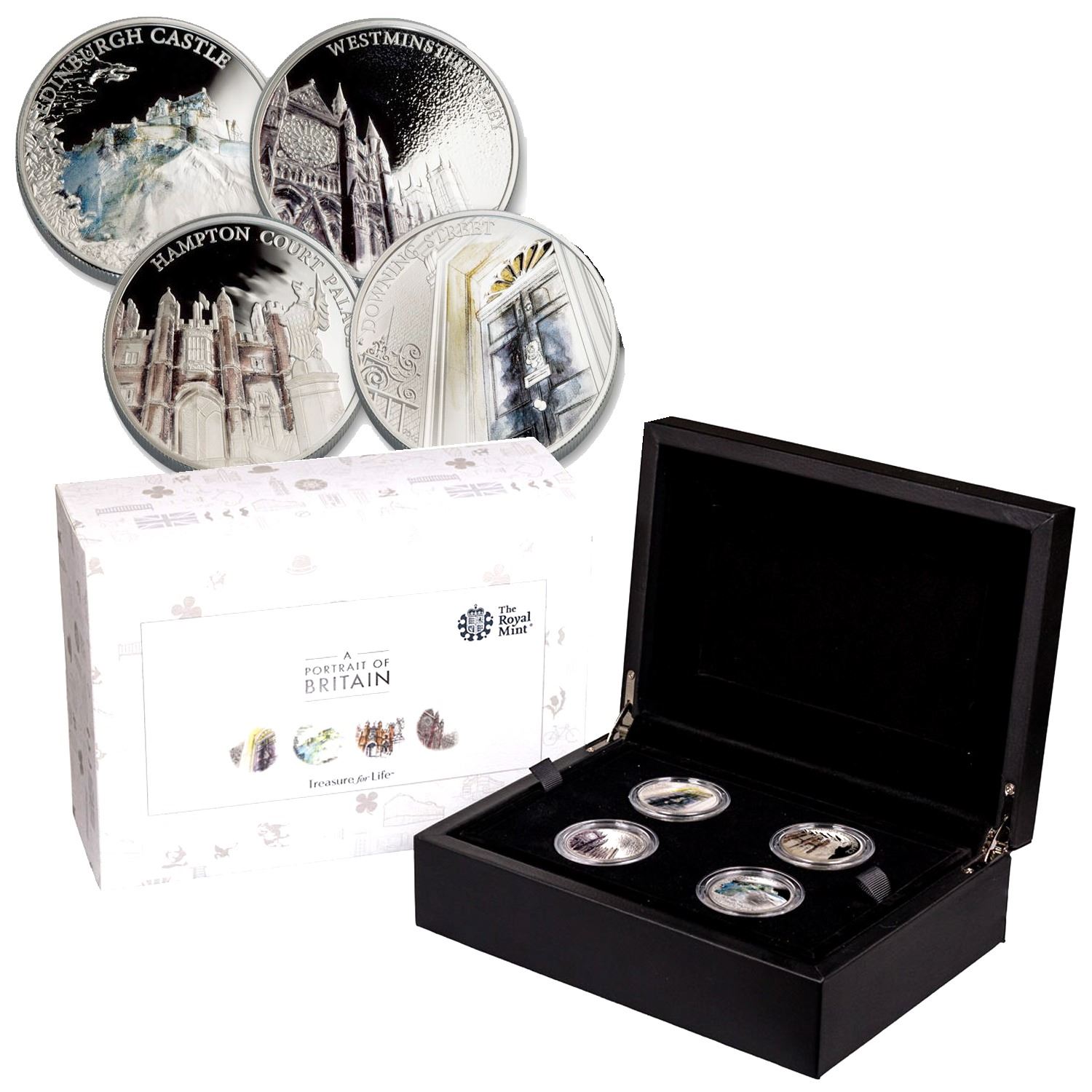 *2017 United Kingdom A Portrait of Britain 5 Pound 4-coin Sterling Silver Coloured Set in Deluxe Box.