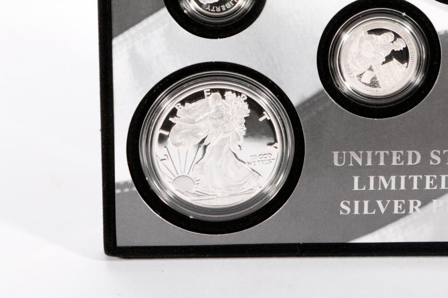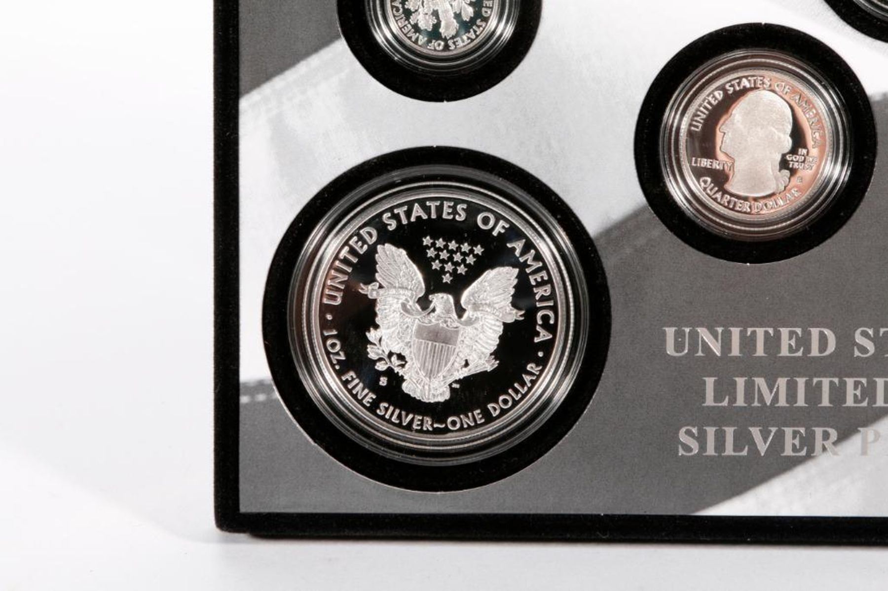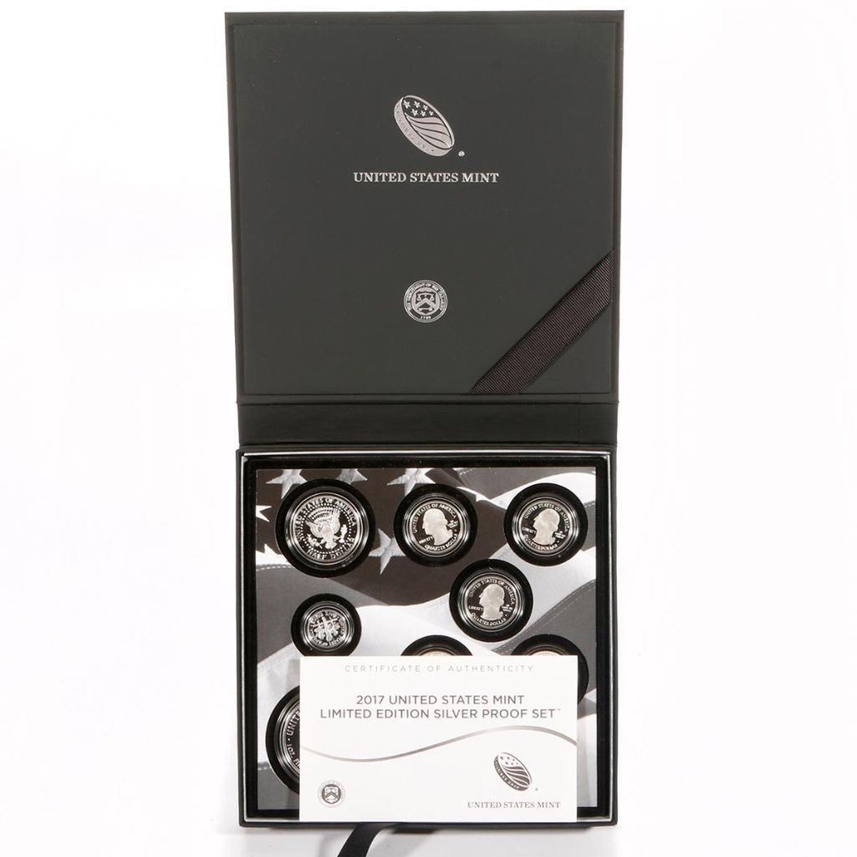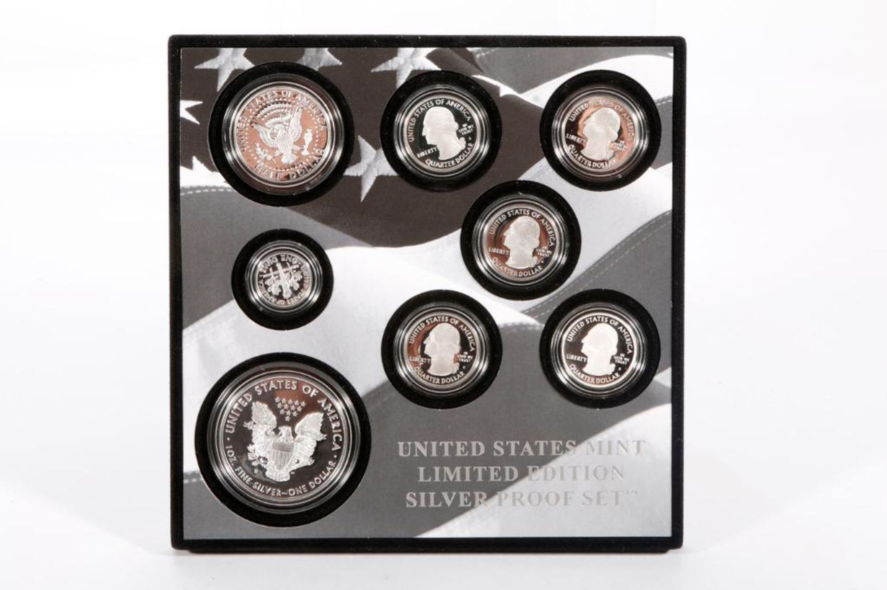 (1) American Eagle One Ounce Silver Proof Coin. (5) Quarters from the America the Beautiful Quarters Program honoring Effigy Mounds National Monument in Iowa; Frederick Douglass National Historic Site in the District of Columbia; Ozark National Scenic River ways in Missouri; Ellis Island in New Jersey; and George Rogers Clark National Historical Park in Indiana (1) Kennedy half dollar (1) Roosevelt dime.