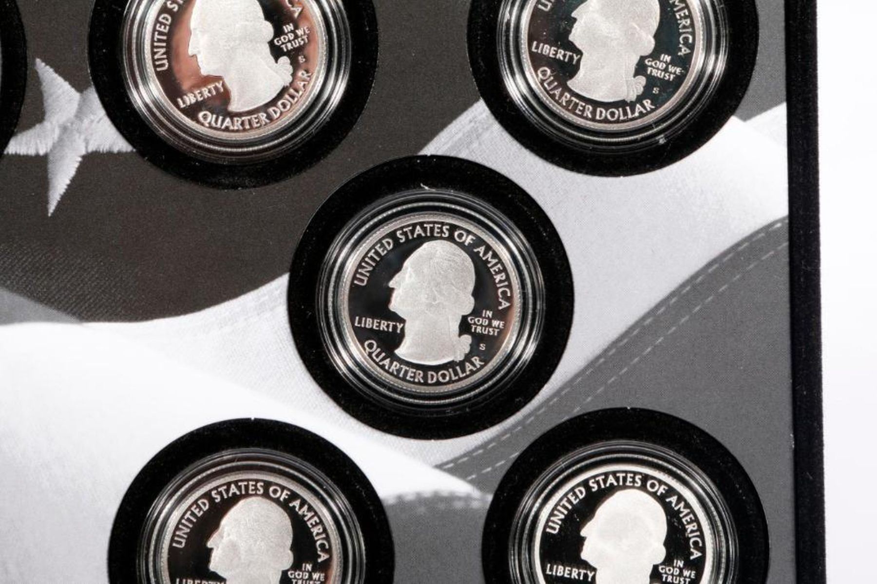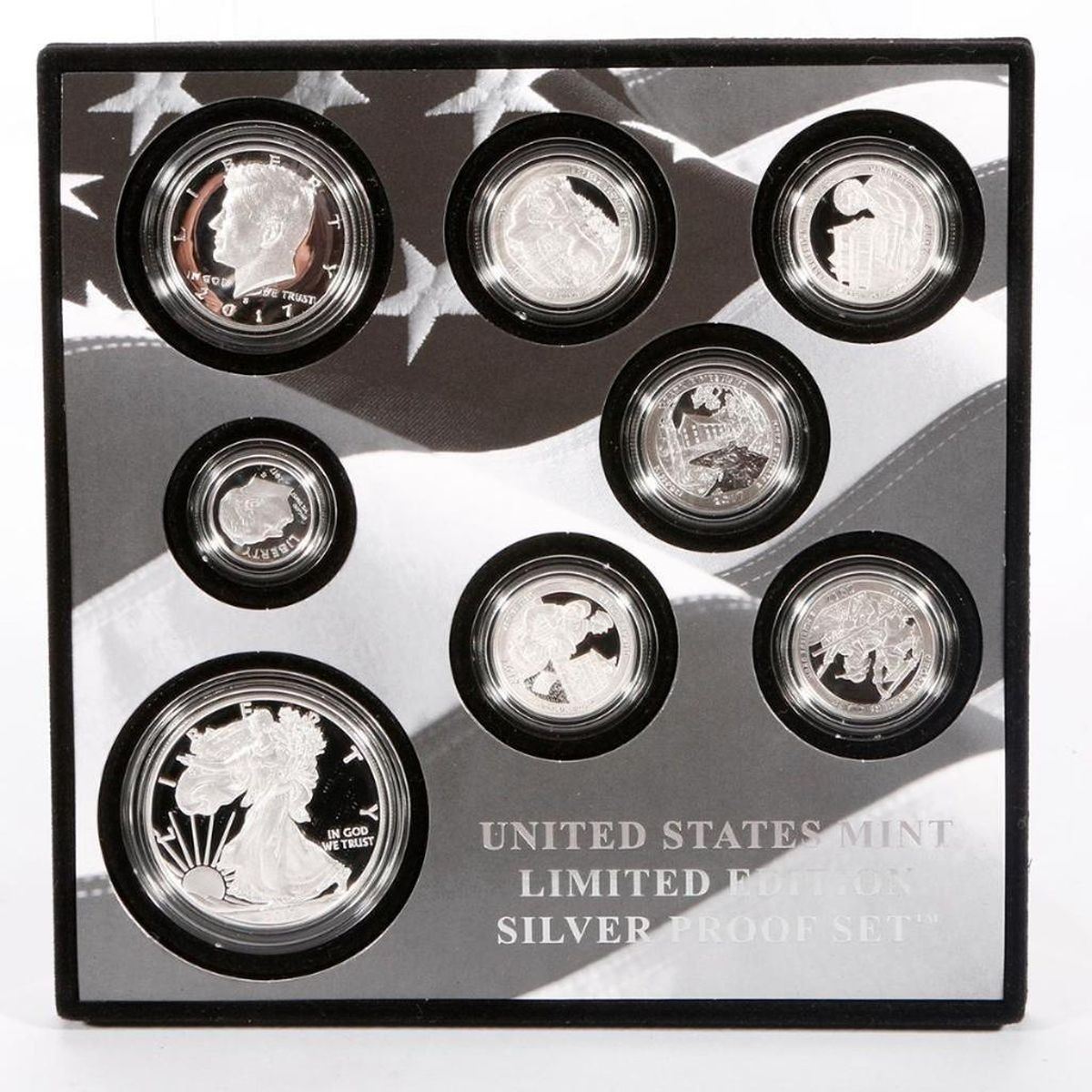 (1) American Eagle One Ounce Silver Proof Coin. (5) Quarters from the America the Beautiful Quarters Program honoring Effigy Mounds National Monument in Iowa; Frederick Douglass National Historic Site in the District of Columbia; Ozark National Scenic River ways in Missouri; Ellis Island in New Jersey; and George Rogers Clark National Historical Park in Indiana (1) Kennedy half dollar (1) Roosevelt dime.