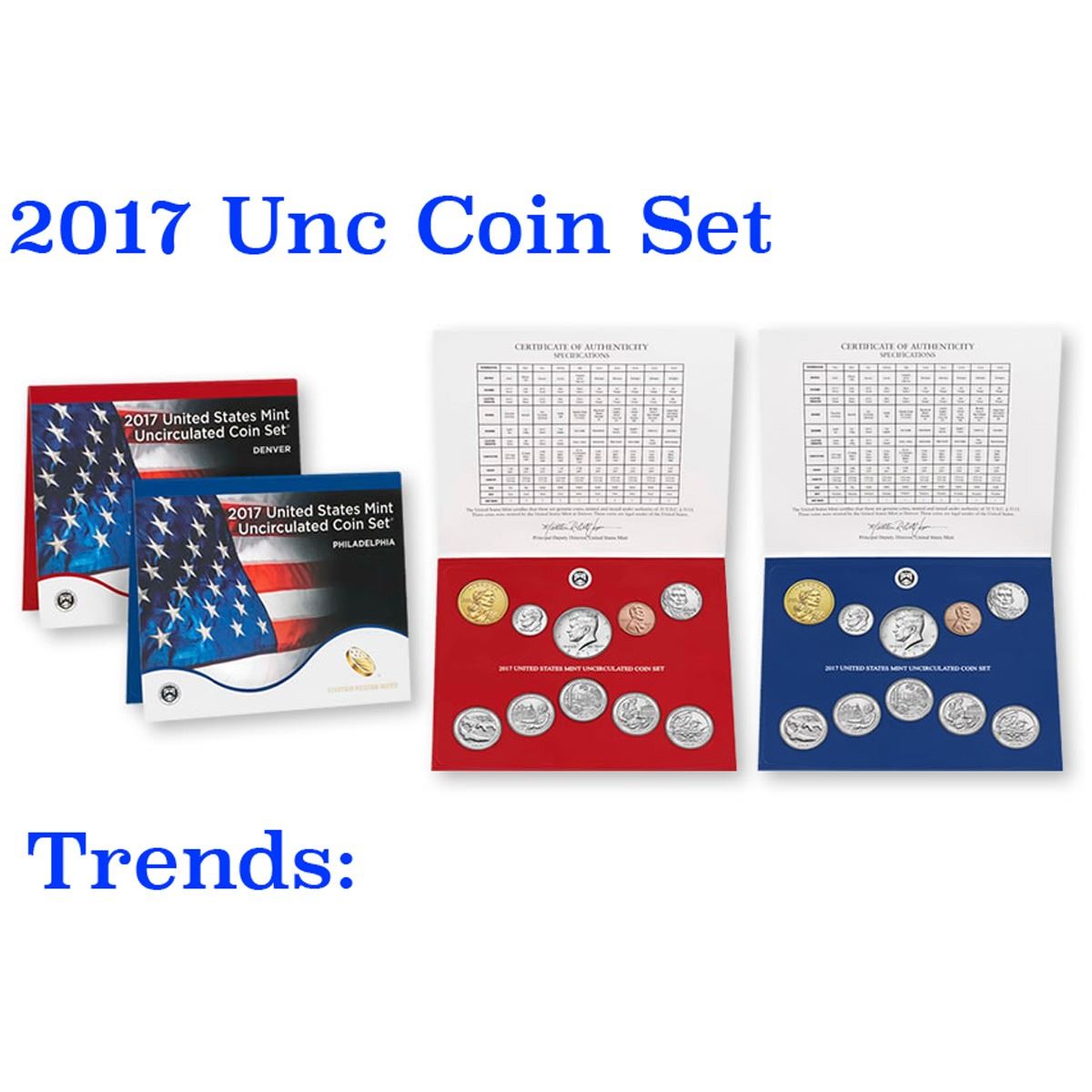2017 United States P & D Mint Uncirculated Coin Set 20 coins. The 2017 United States Mint Uncirculated Coin Set® contains two folders of 10 coins each, one from the United States Mint at Philadelphia and the other from the United States Mint at Denver, for a total of 20 coins. Each folder includes these 2017–dated coins with uncirculated finishes: Five quarters from the America the Beautiful Quarters Program, One Native American $1 Coin, One Kennedy half dollar, One Roosevelt dime, One Jefferson nickel, and One Lincoln penny.