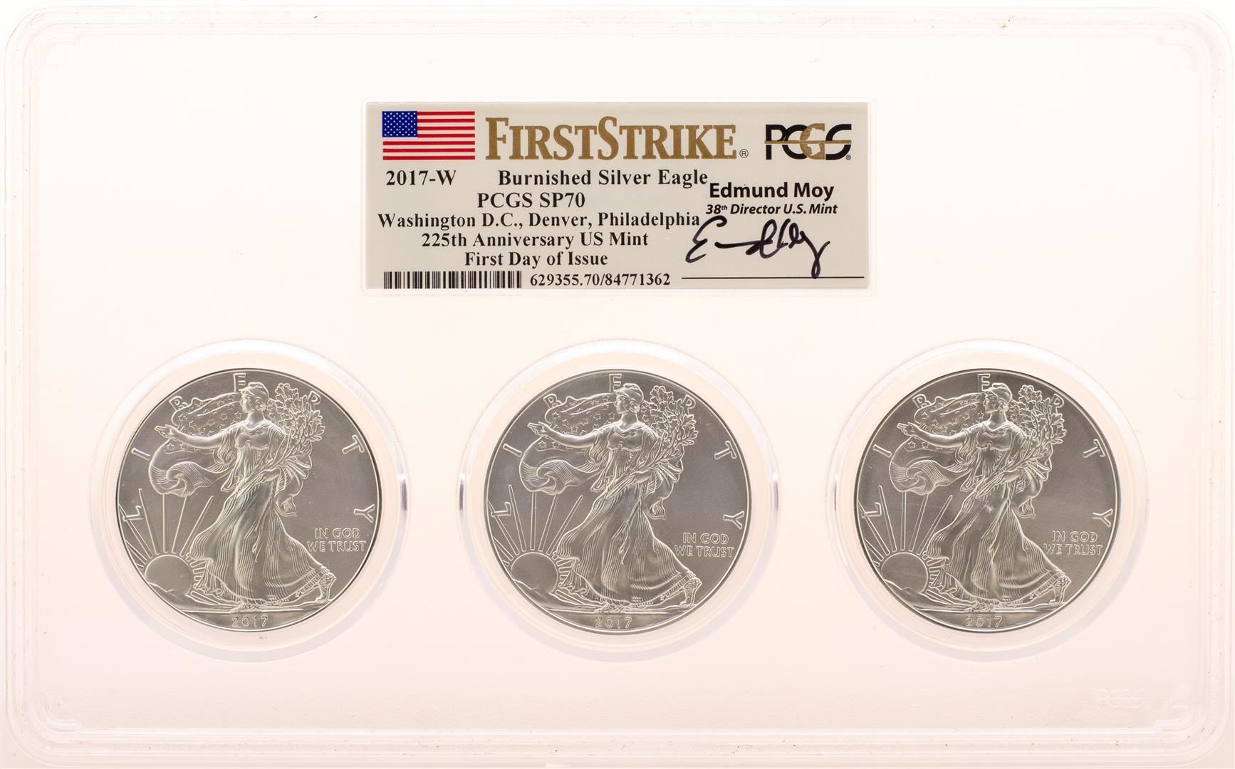 2017-W Burnished Silver Eagle Location Set PCGS SP70 First Strike Edmund Moy Signature