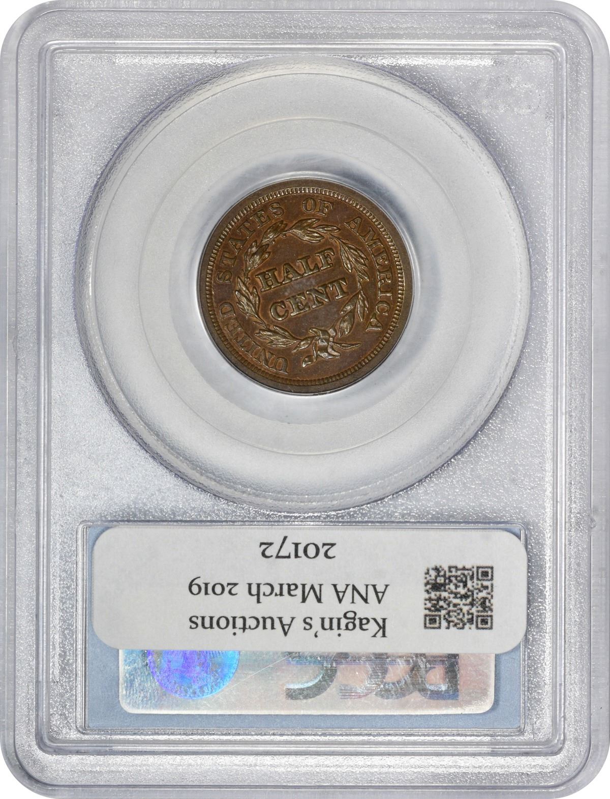 Glossy deep golden-tan throughout with traces of mint orange at the devices. One of those coins: your first impulse is a much higher grade, and a glass will do little to dissuade from that mindset. Though tiny marks are present under low magnification, the in-hand eye appeal is substantial – please refer to our previous comment. From a modest mintage of 39,812 pieces, just 52 pieces fewer than the 1849 Large Date half cent’s mintage. Sharply struck throughout and undeniably choice for the assigned grade. PCGS #1221