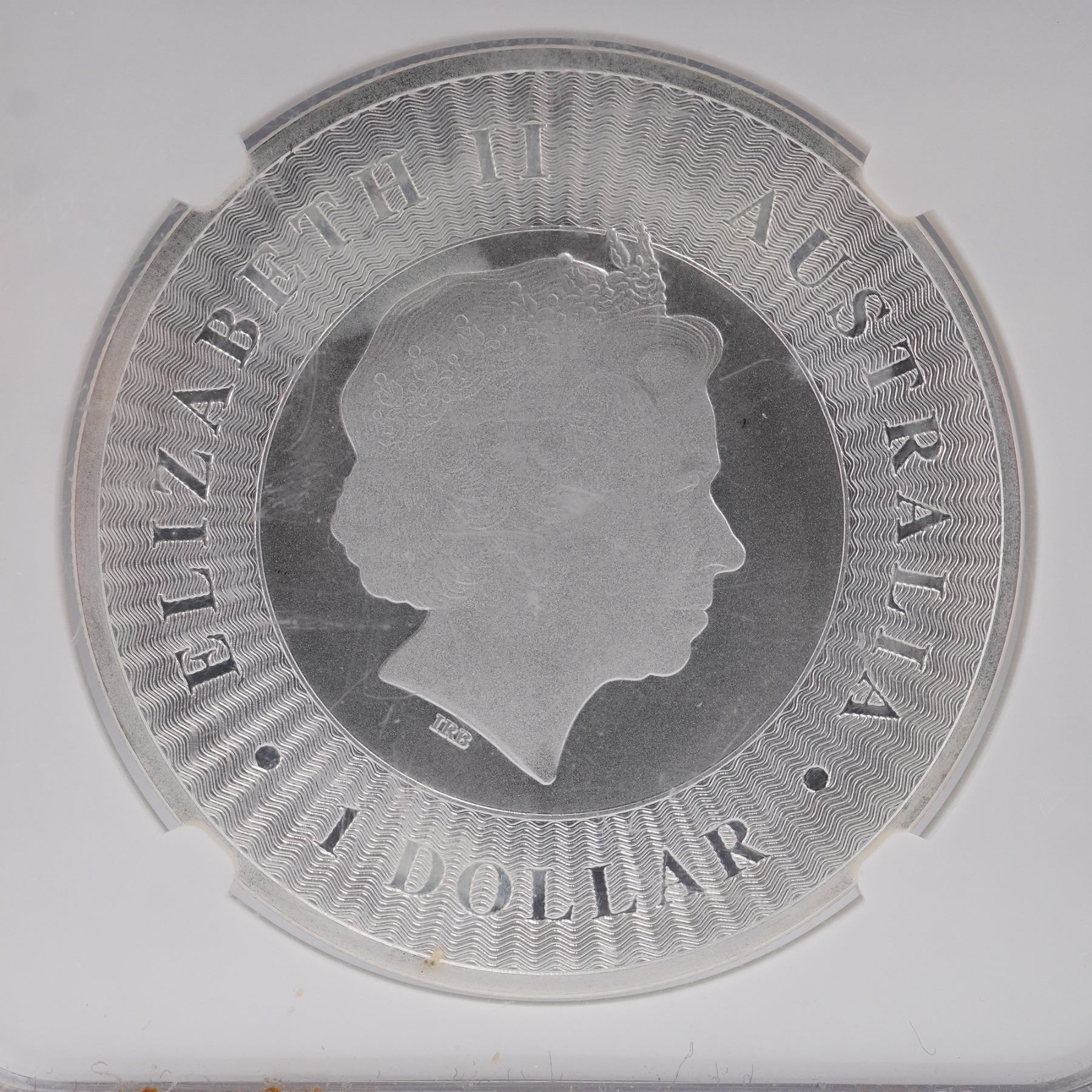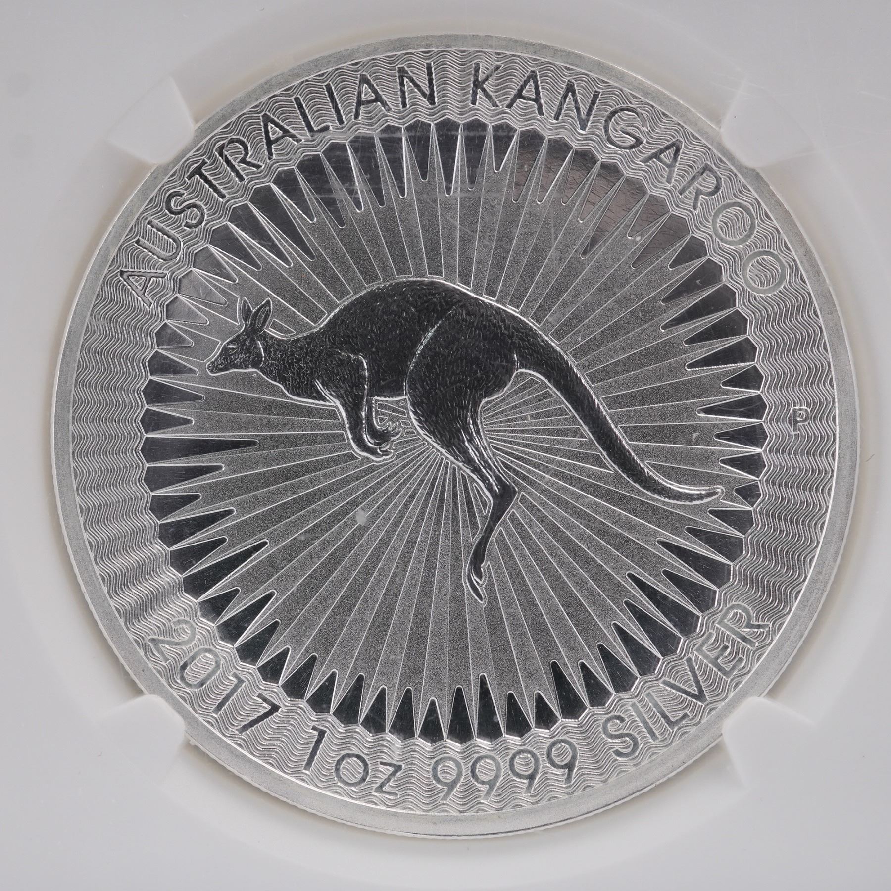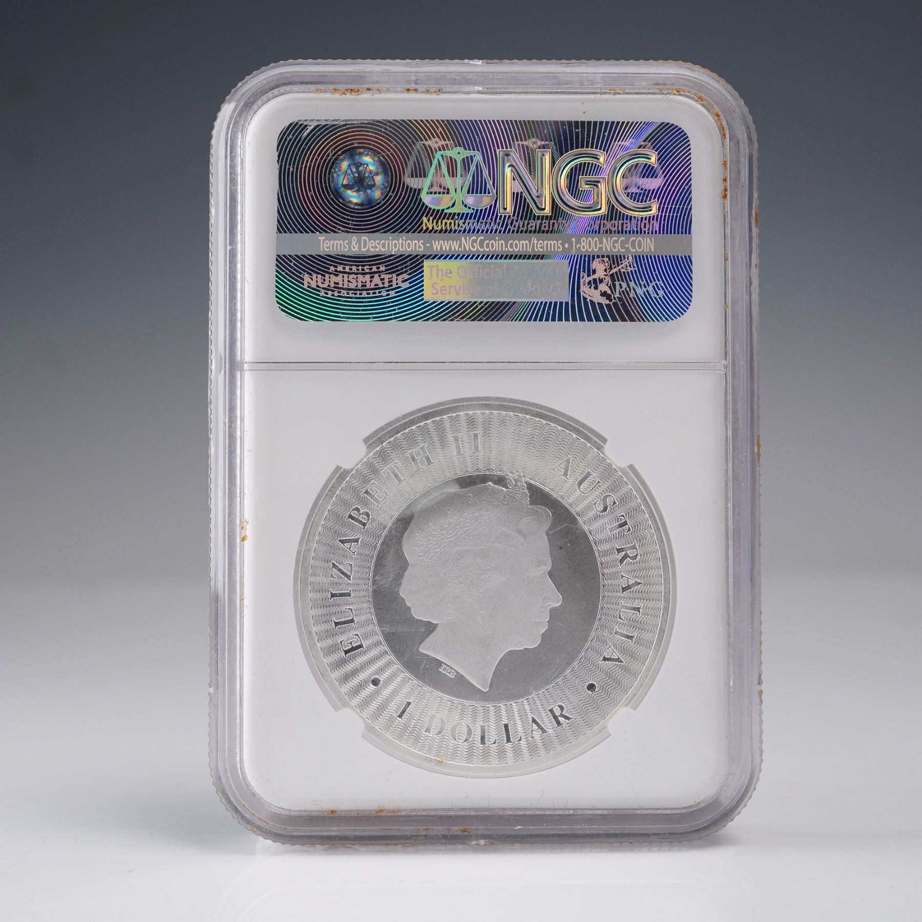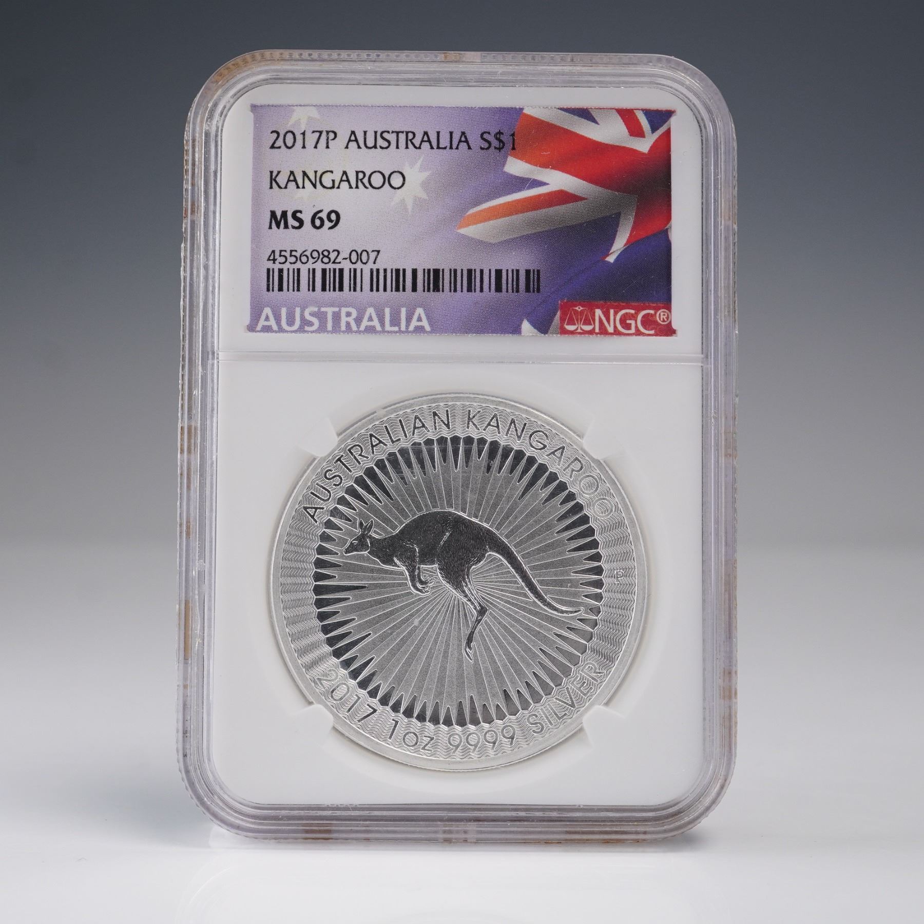 This 2017 Australian Kangaroo one dollar coin, meticulously struck in one troy ounce of .9999 fine silver, bears the Perth Mint's distinctive 'P' mintmark. Graded MS69 by NGC. A commemorative issue, the obverse depicts a finely engraved profile of Queen Elizabeth II surrounded by a detailed guilloche pattern and the inscriptions "ELIZABETH II," "AUSTRALIA," and "1 DOLLAR." The reverse features a leaping kangaroo encircled by an intricate burst pattern that radiates from the center. Housed in a slab for preservation and authentication. Slab measures: 2.25"L x 0.25"W x 3.25"H. Coin diameter: 40.6 mm.