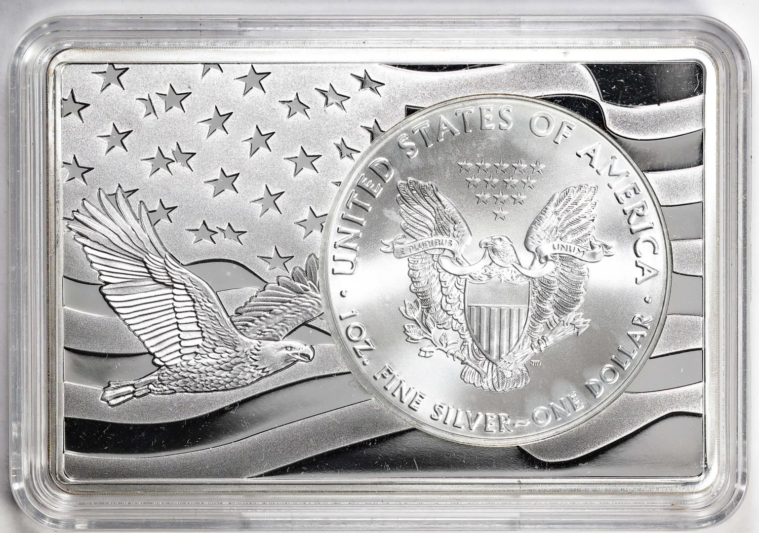 One 2018 $1 American Silver Eagle Coin & 2oz Silver Bar Set.