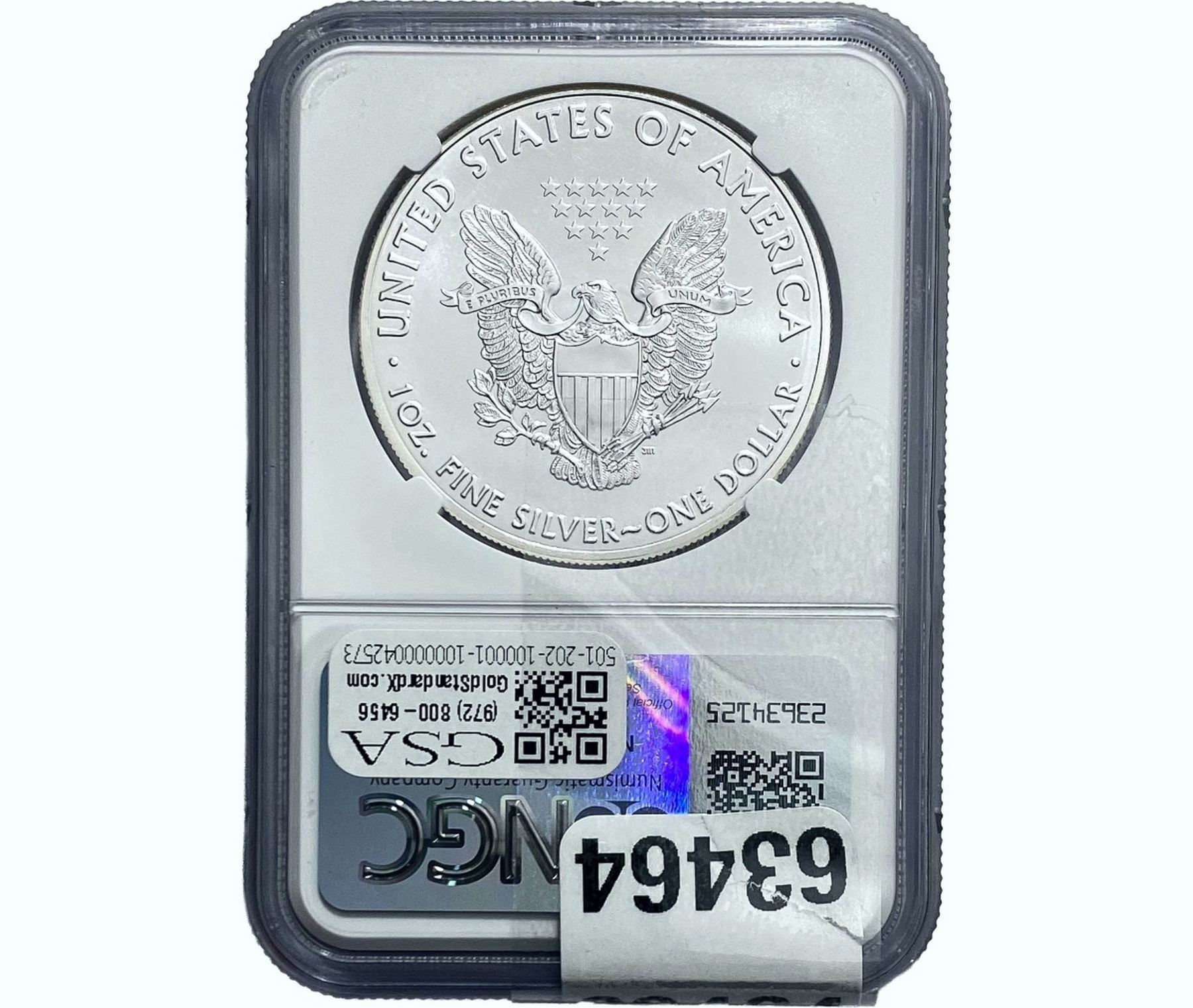 e. Coins sold referencing a third-party grading service are sold “AS IS” without any express or implied warranty, except for a guarantee by GSA that they are genuine. Removal or alteration of the holder, voids all of Bidder’s claims concerning that Product. Certain warranties may be available from the grading services and Bidders are referred to them for further details: Numismatic Guaranty Corporation (NGC), PO Box 4776, Sarasota, FL 34230, www.ngccoin.com/services/writtenguarantee.asp; Professional Coin Grading Services (PCGS), PO Box 9458, Newport Beach, CA 92658, www.pcgs.com/guarantee.html; ANACS, 6555 S. Kenton St., Ste. 303, Englewood, CO 80111; and Independent Coin Grading Co. (ICG), 7901 East Bellview, Ave., Suite 50, Englewood, CO 80111.