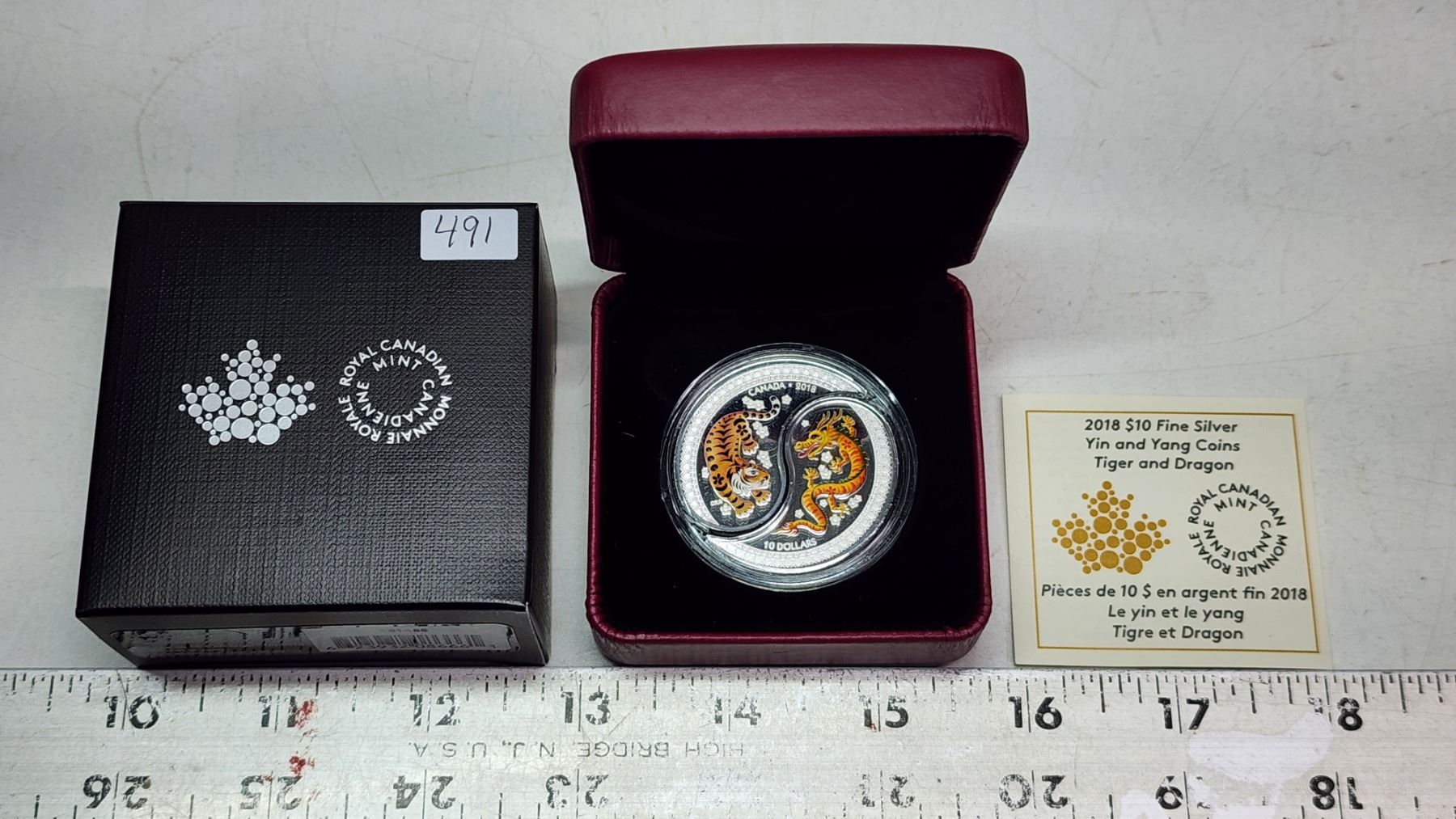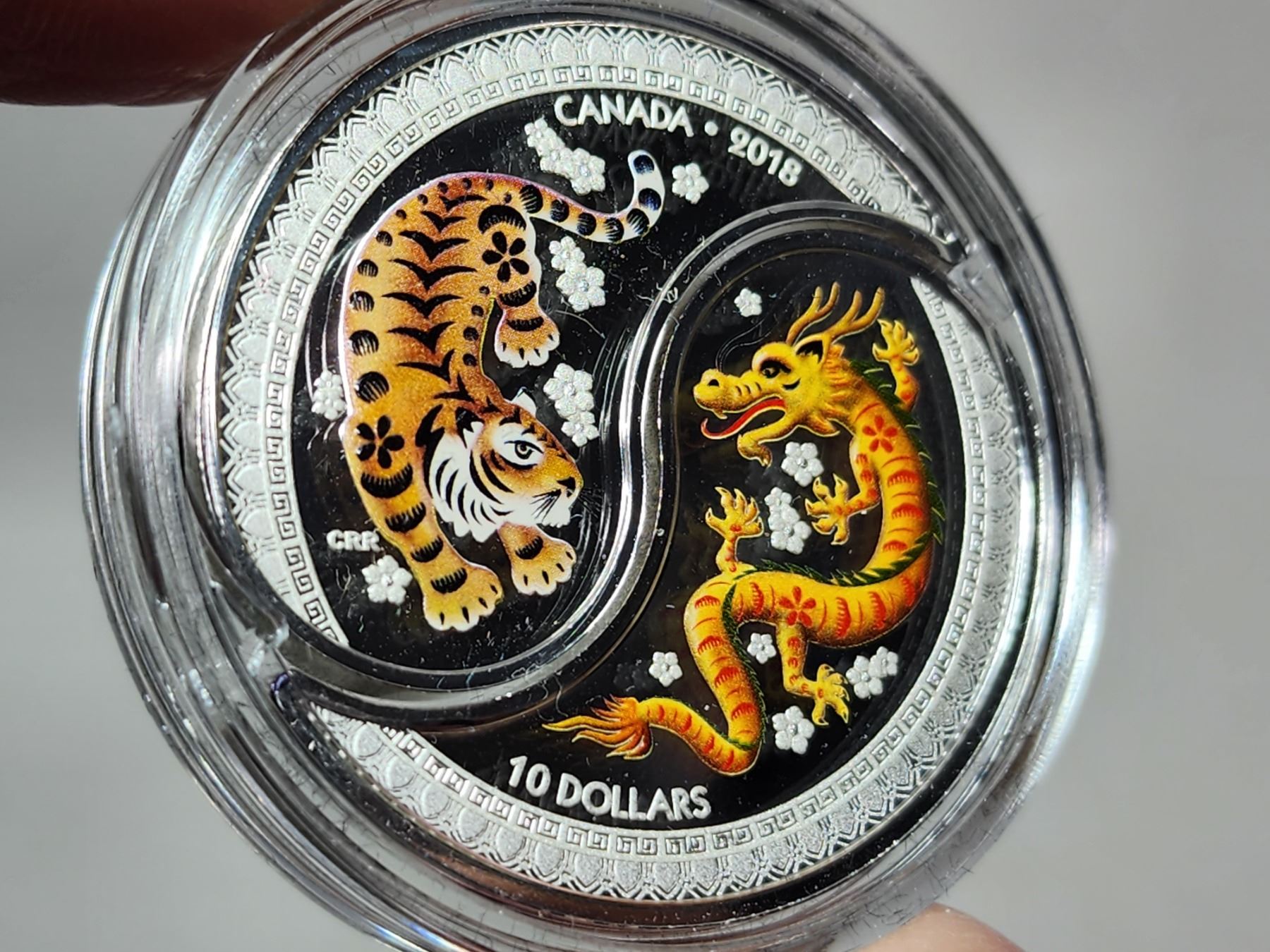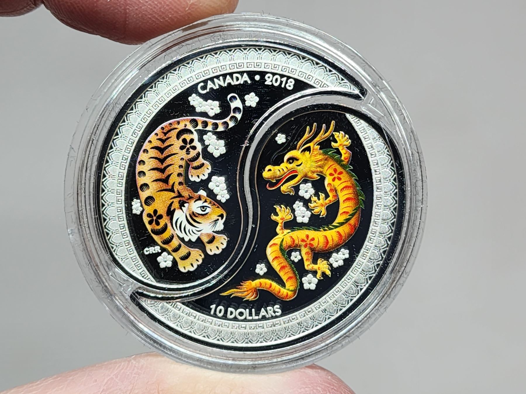 2018 $10 Yin & Yang: Tiger & Dragon. Colourized. 99.99% pure Silver. Proof. Housed in its original RCM case & box of issue.